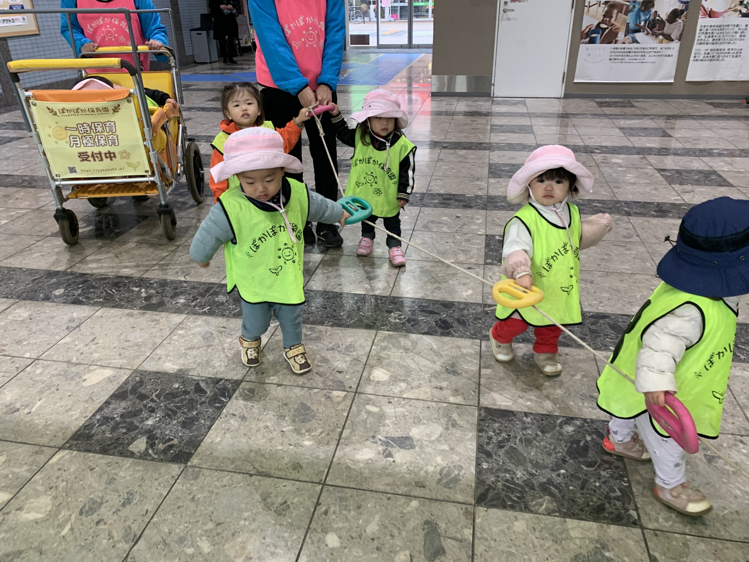 先生が「みんなで一緒にお散歩行こうね!」と声をかけると、小さな手をロープから離さずに、しっかりと前を見て歩けていました。