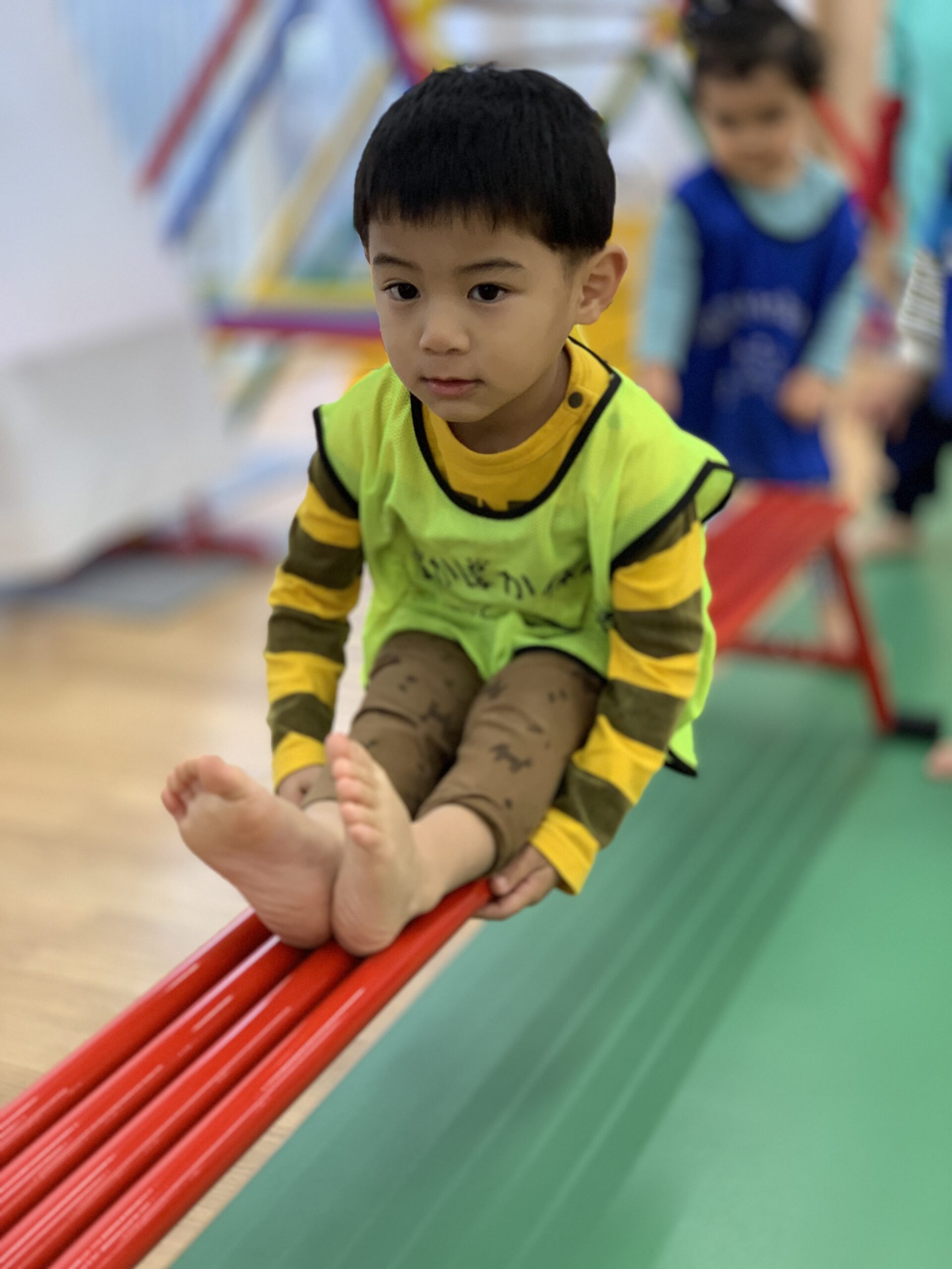 赤いマーカーの上を一本橋のように集中して歩いたり、平均台をお尻を使ってゆっくりと進んだり、全身のバランス感覚を養います。