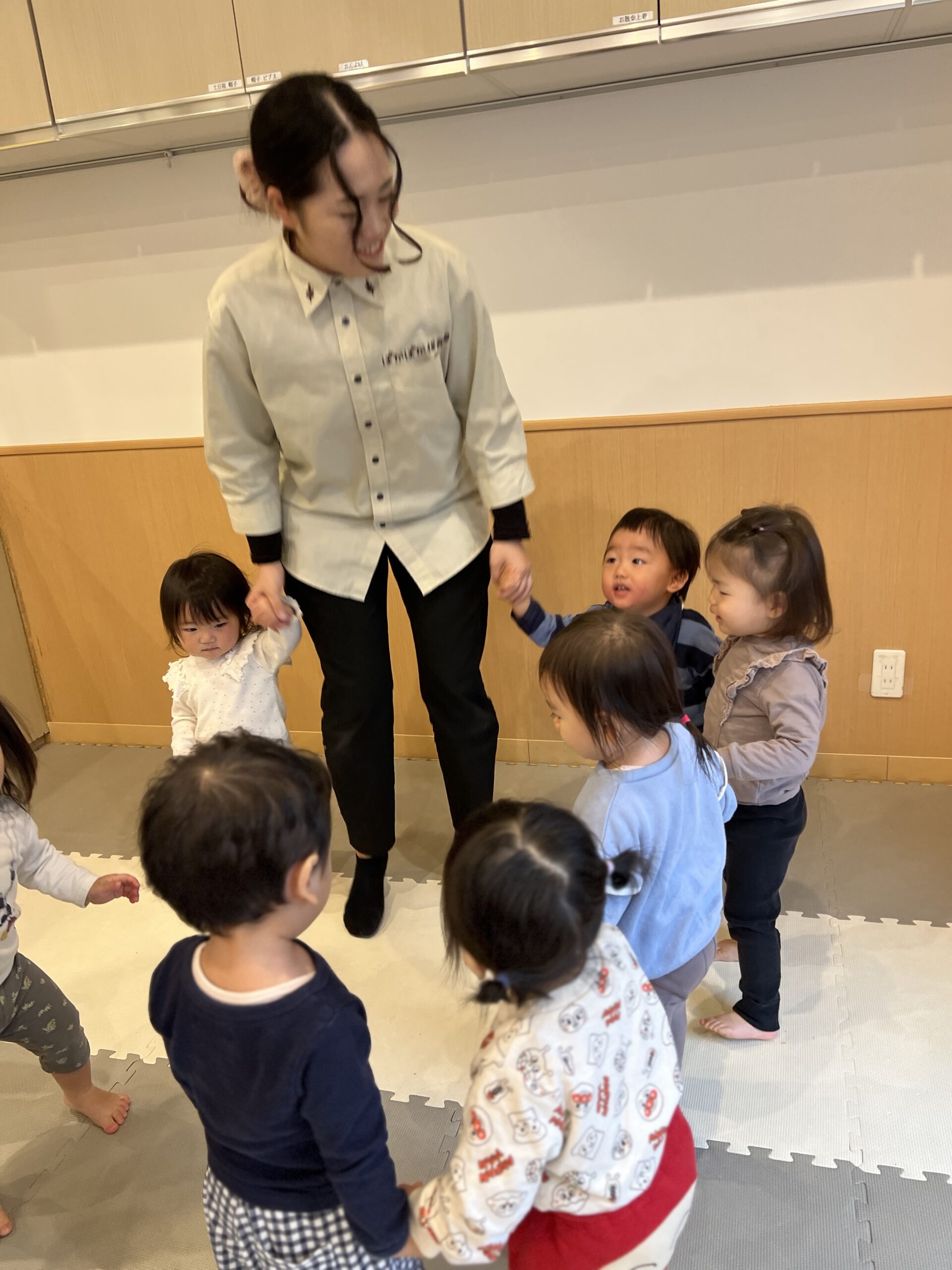 その頃、ぽかぽか保育園の室内では、0歳児さんと1歳児さんのお友だちが活動していました。