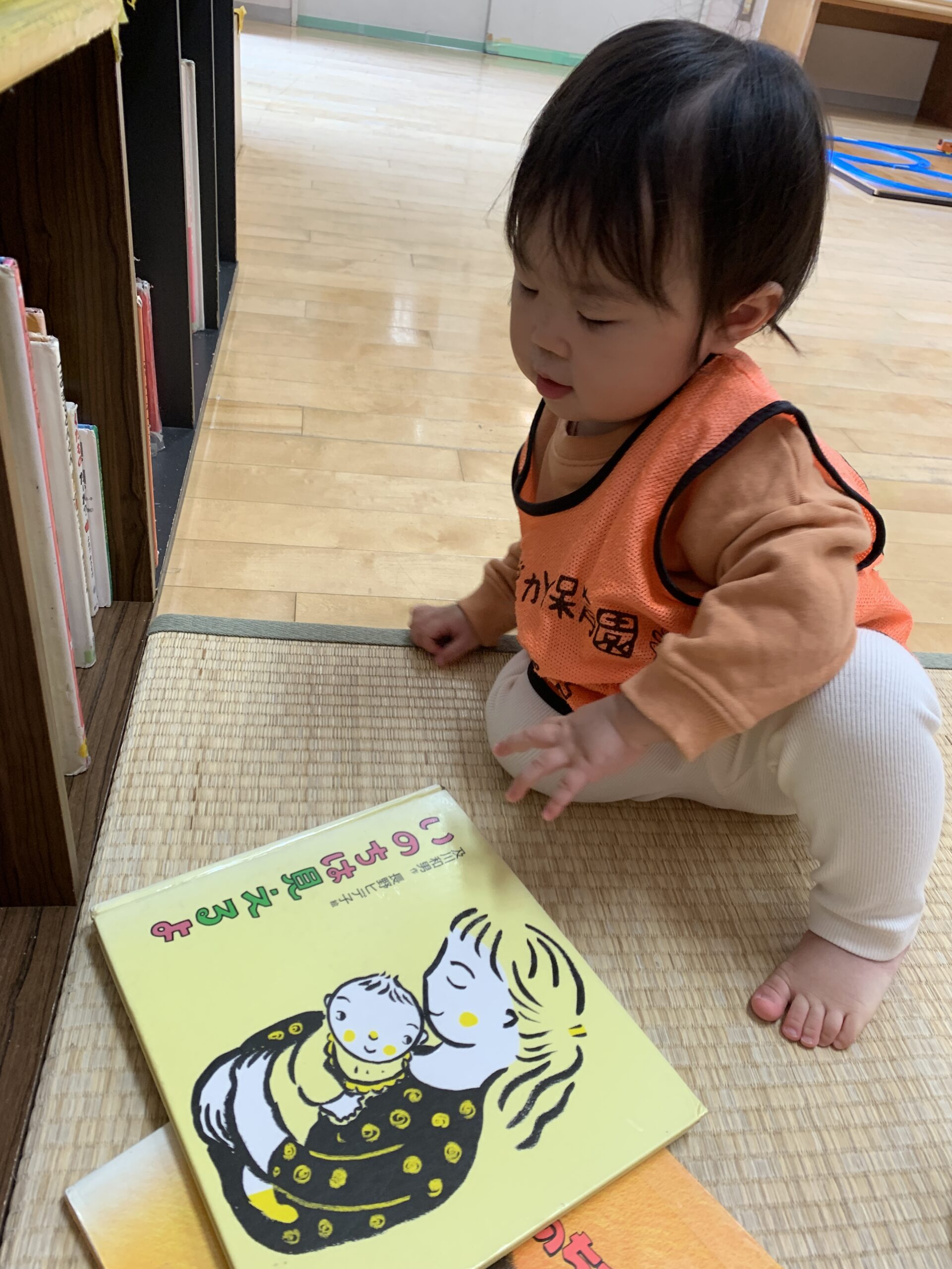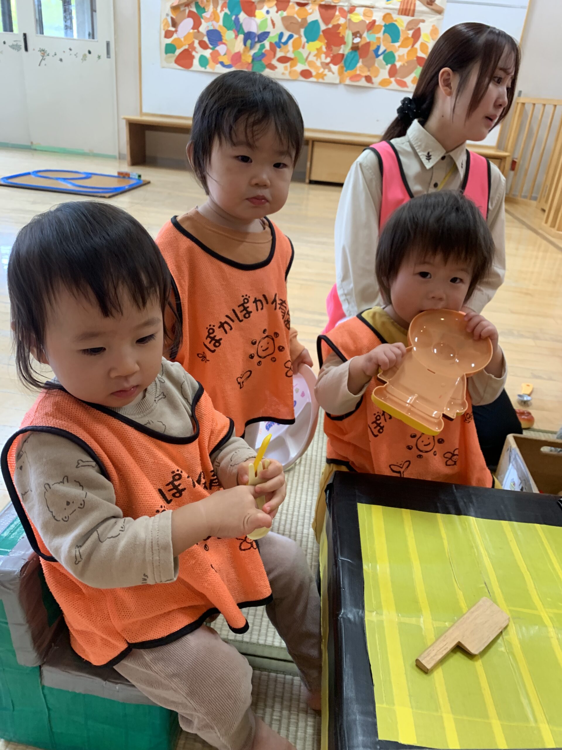 おままごとコーナーではお皿にお野菜を並べて「ごはんできたよ」と遊ぶ子、絵本コーナーではお気に入りのページを見つけてじっと眺める子も。