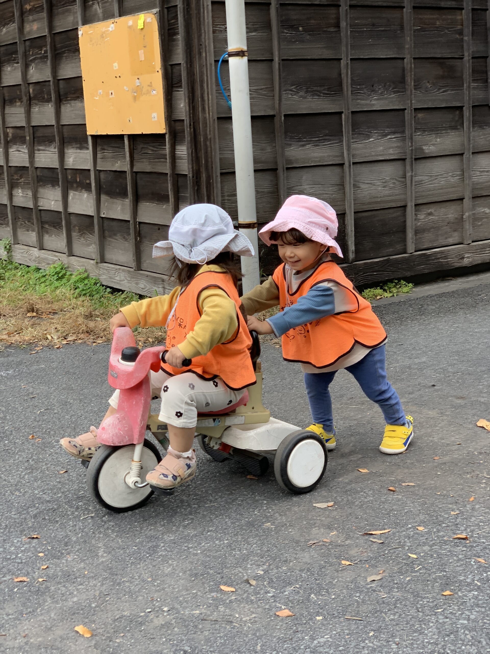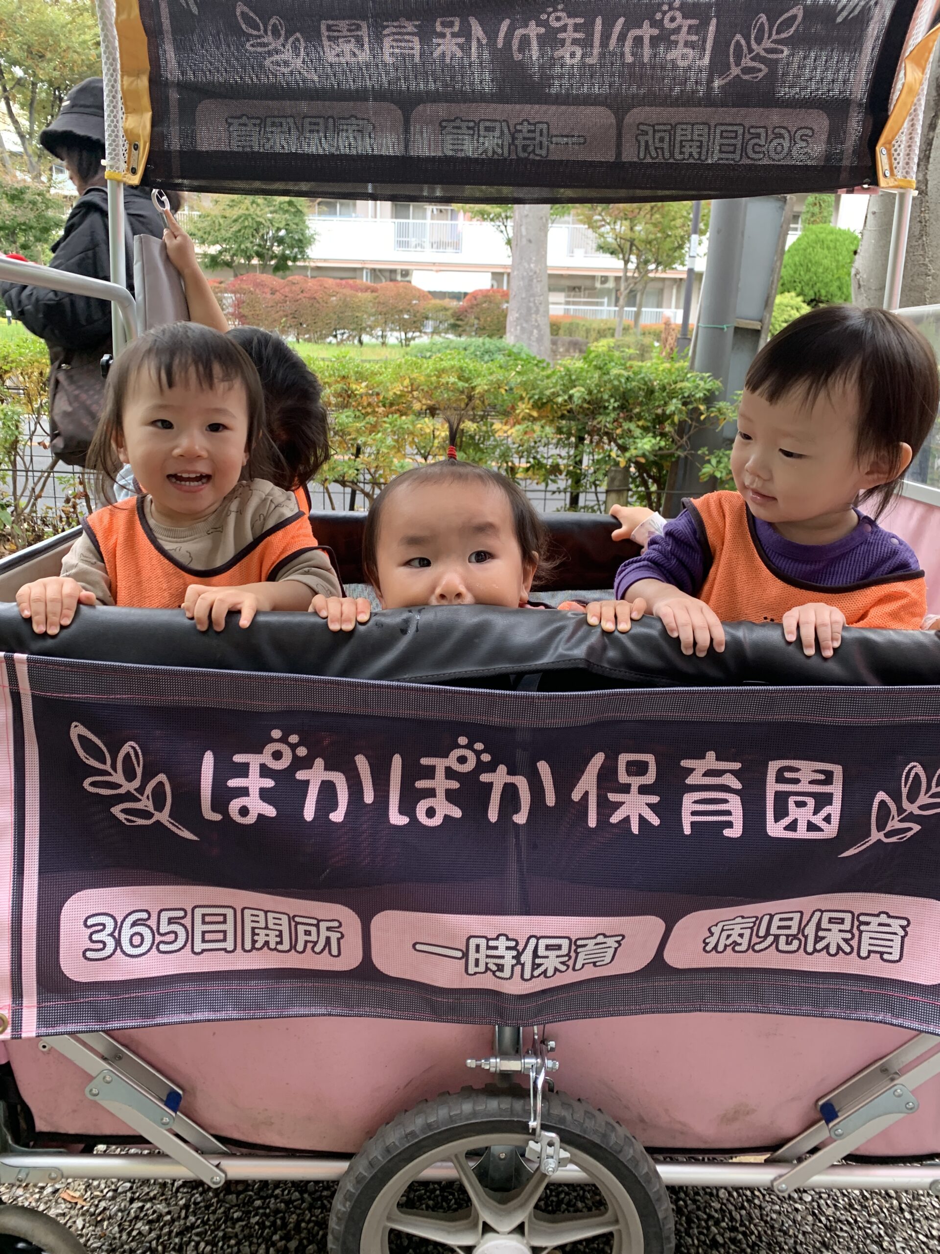 カートの中から見える街の風景や、通り過ぎる人々に手を振る姿がとても可愛らしく、先生たちも思わず笑顔に♡