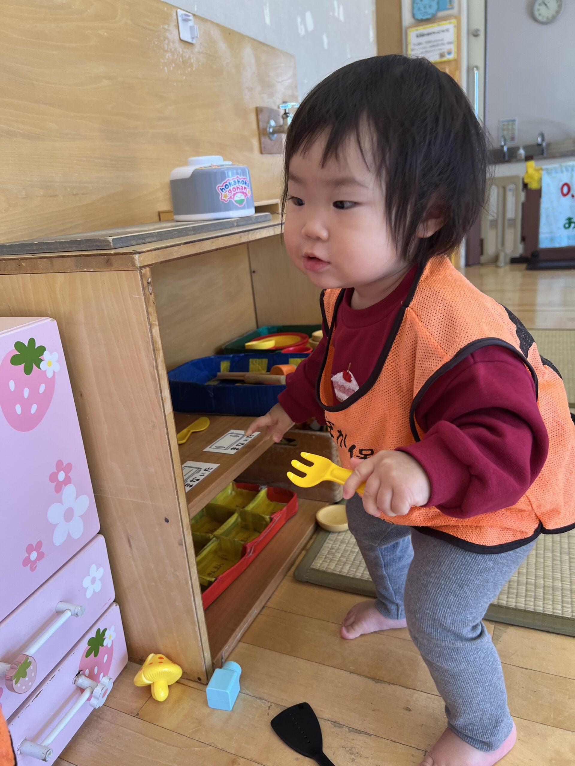 おままごとコーナーでは、お鍋やフライパンを使って、先生やお友だちにご飯を作ってあげる姿が見られました。