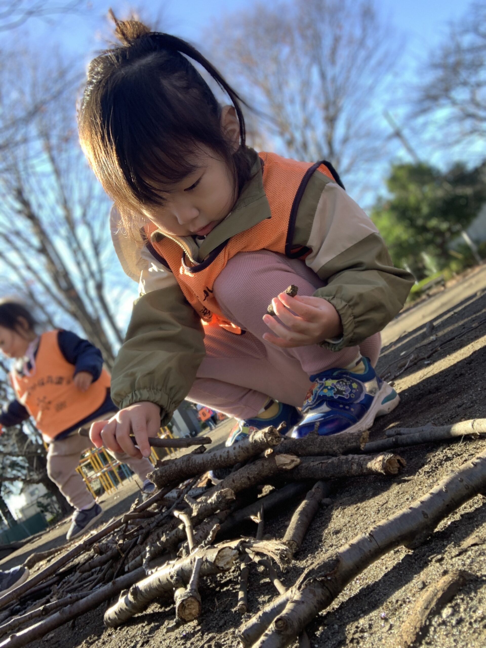 子どもたちは、その木の枝や石を集め始め、「焚き火みたい!」と、自分たちで遊び方を工夫する姿が見られました。