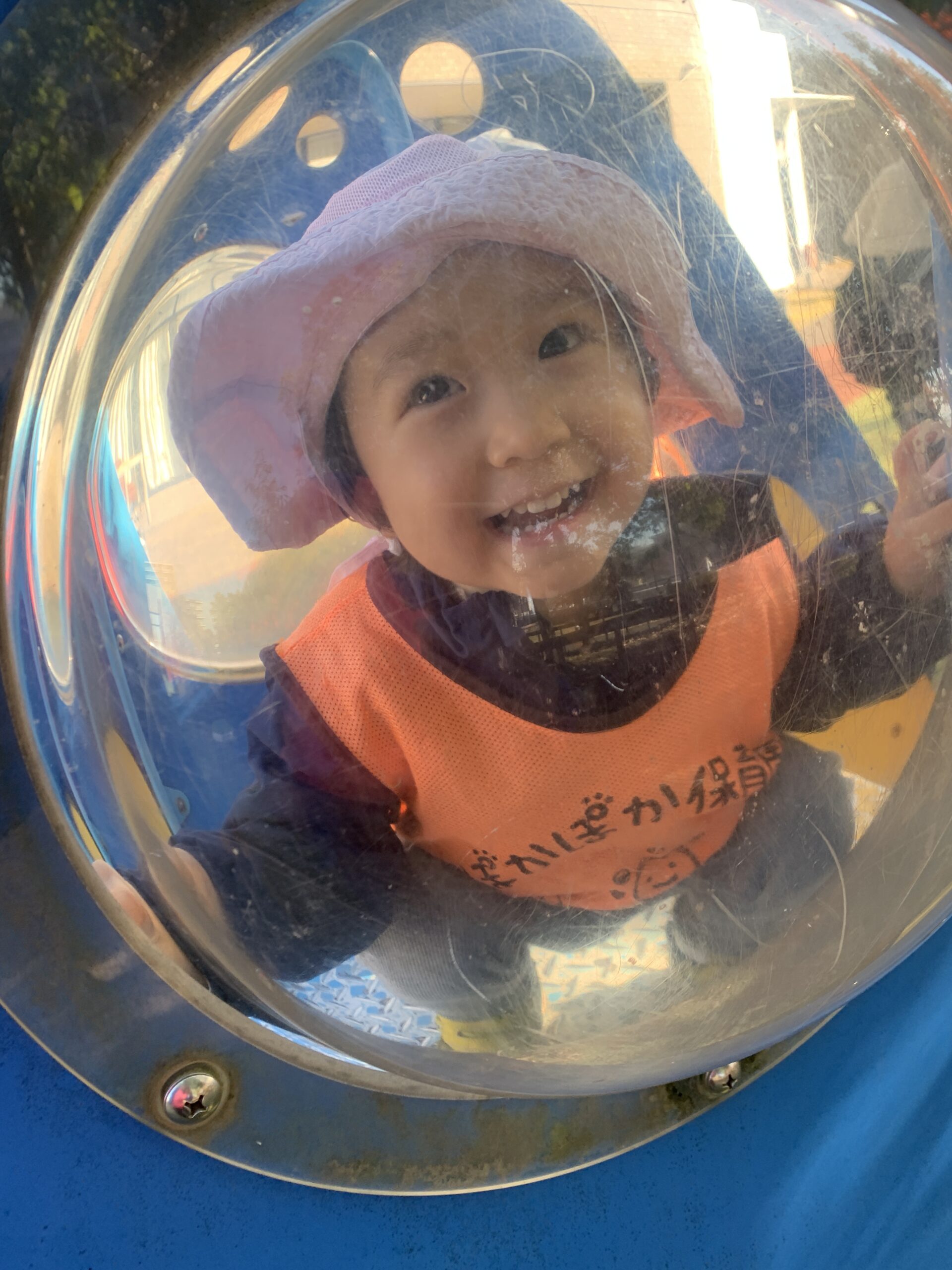 滑り台の途中に開いている窓から「ばあっ!」と顔を出して、お友だちや先生と見つめ合っては、たくさんの笑顔がこぼれていました。