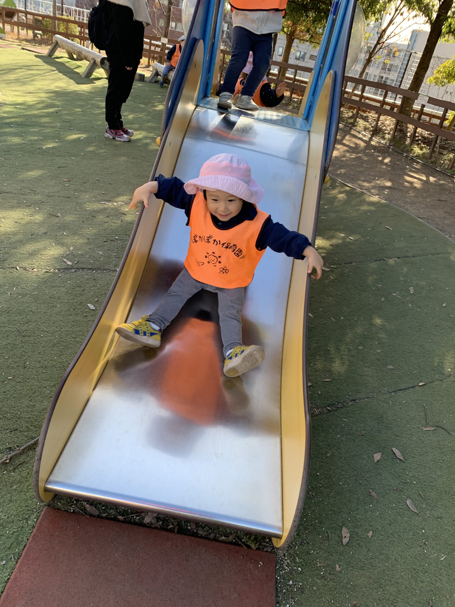 滑り台の途中に開いている窓から「ばあっ!」と顔を出して、お友だちや先生と見つめ合っては、たくさんの笑顔がこぼれていました。