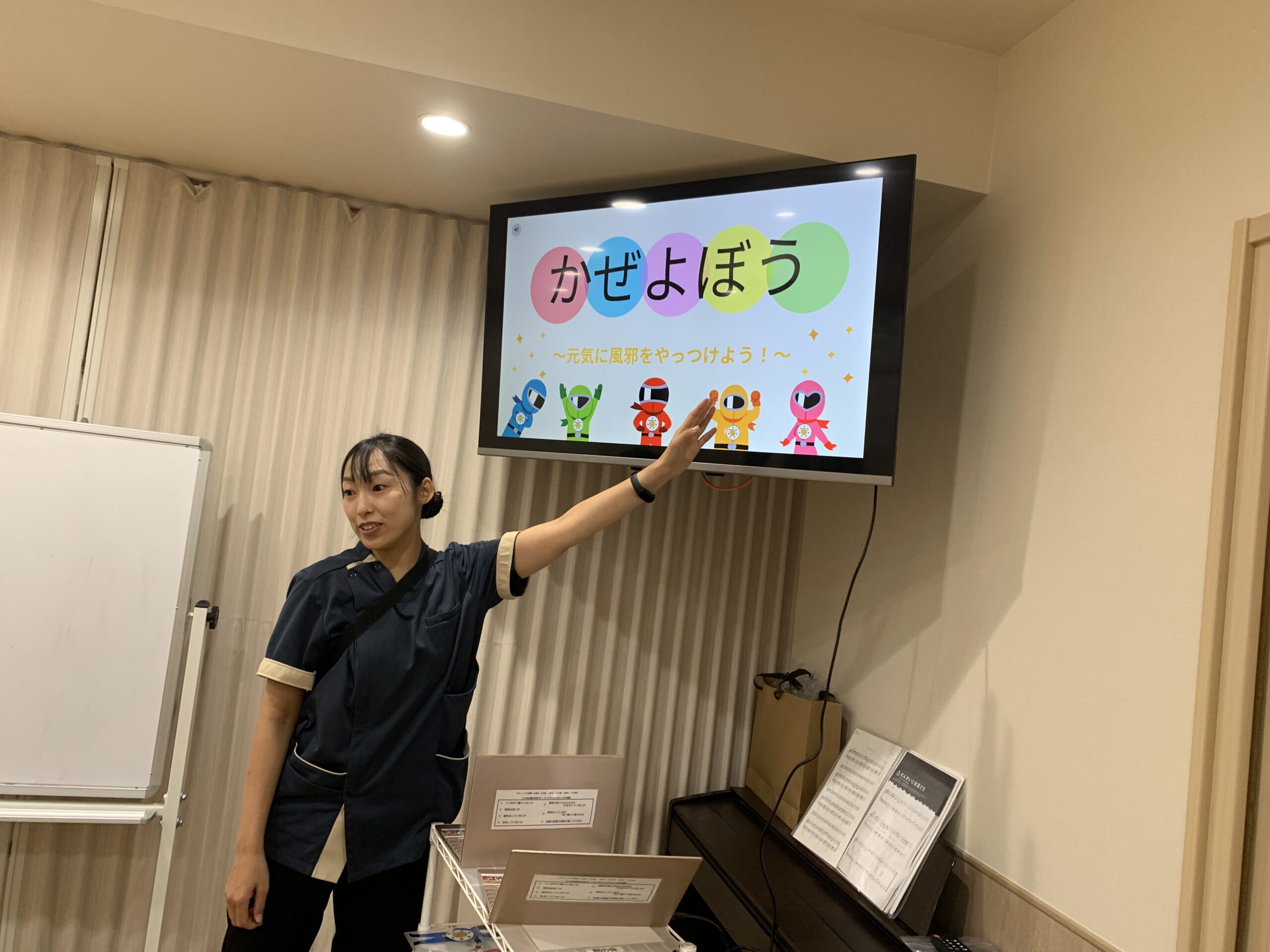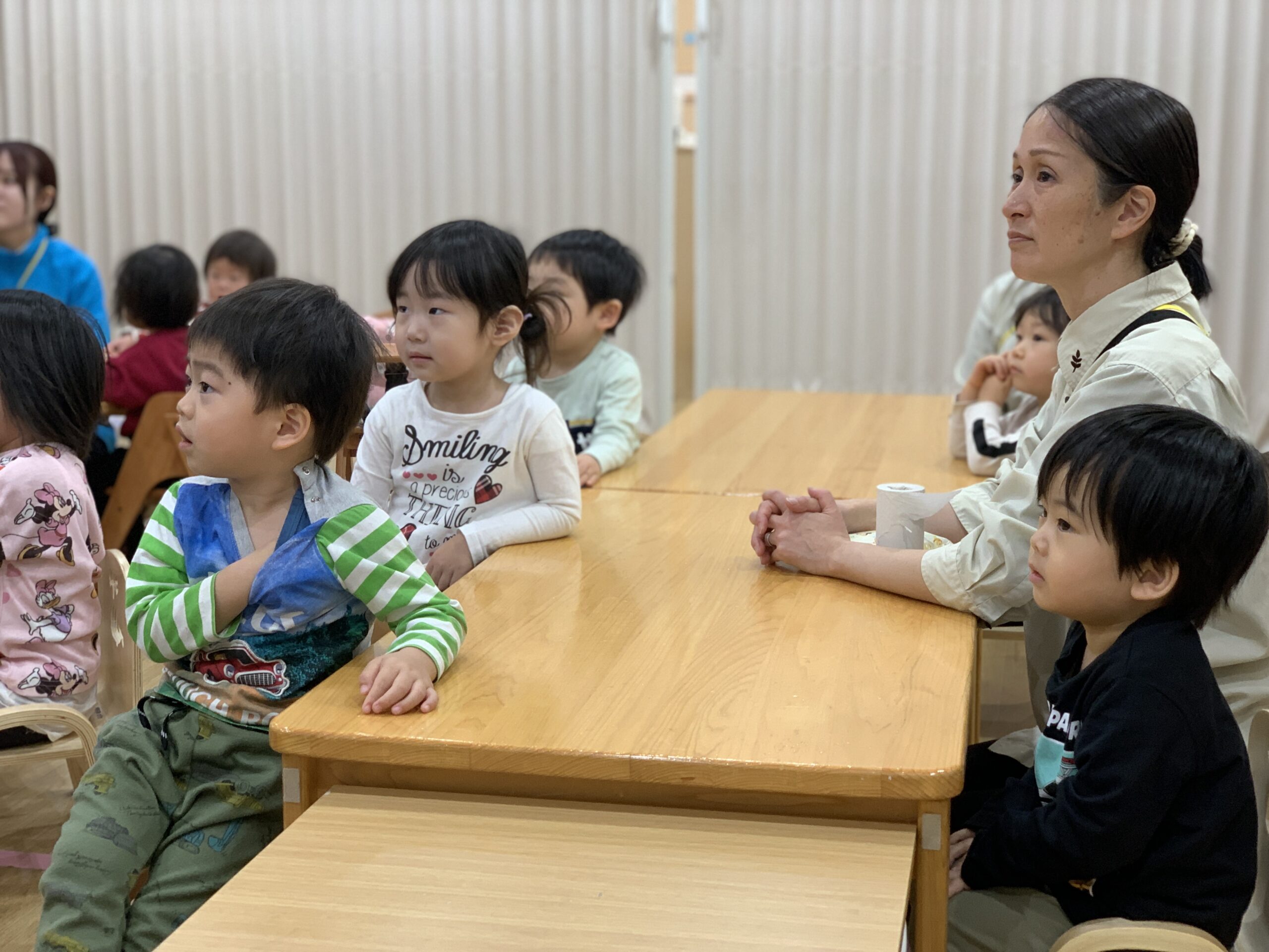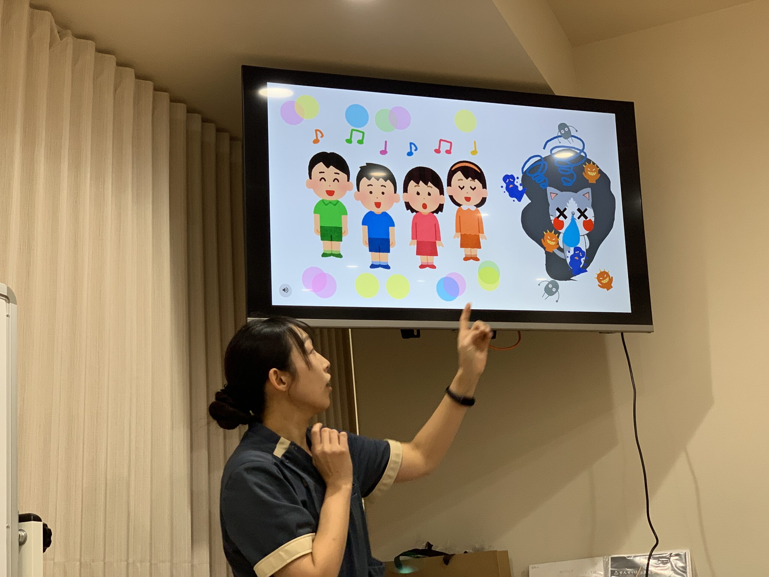 今日の朝おやつが終わった後、子どもたちは風邪予防の「衛生指導」を受けました。