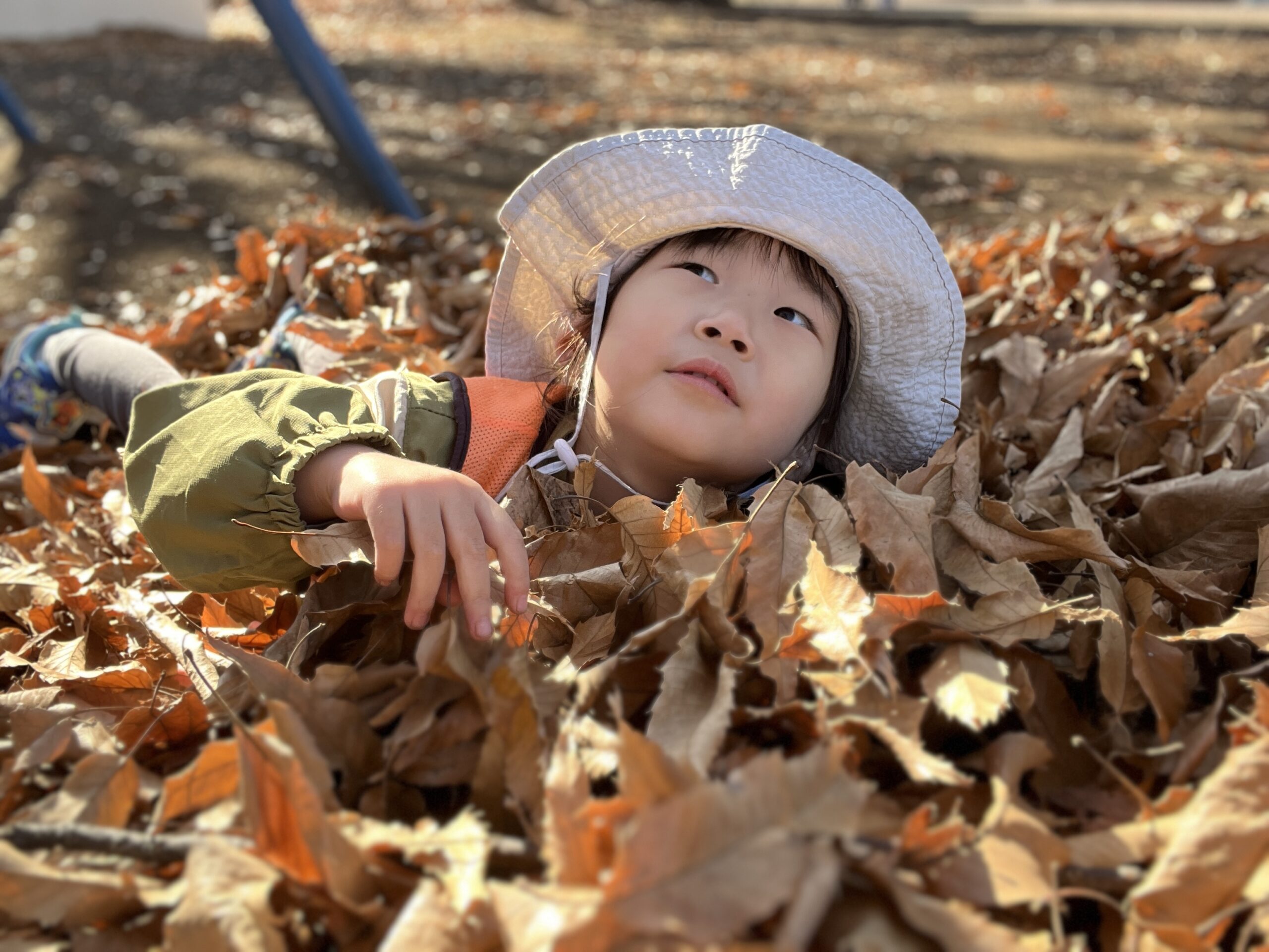 さらには、ふわふわの落ち葉の絨毯に寝転んで「葉っぱのお布団だ!」と、秋の自然を全身で感じていました。