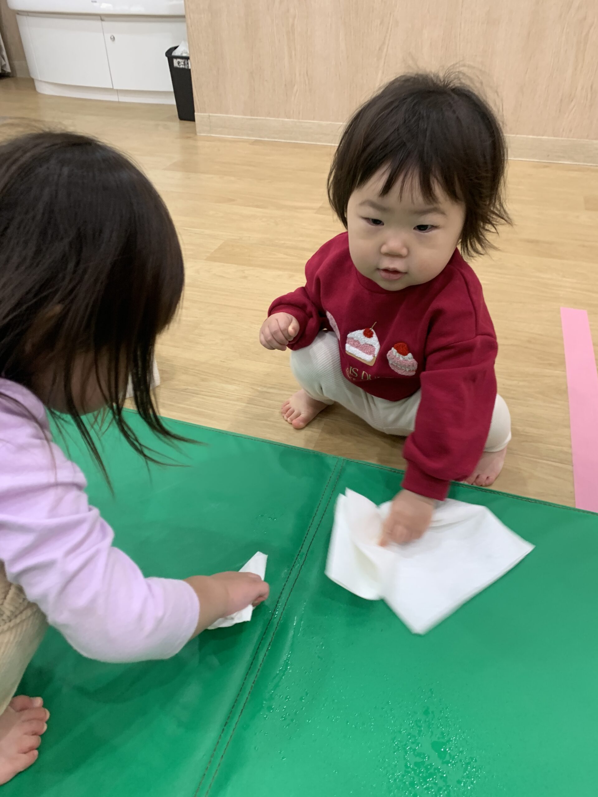 子どもたちは、先生と一緒に雑巾を手に、マットを拭いたり、窓をきれいにするお手伝いをしてくれましたよ。