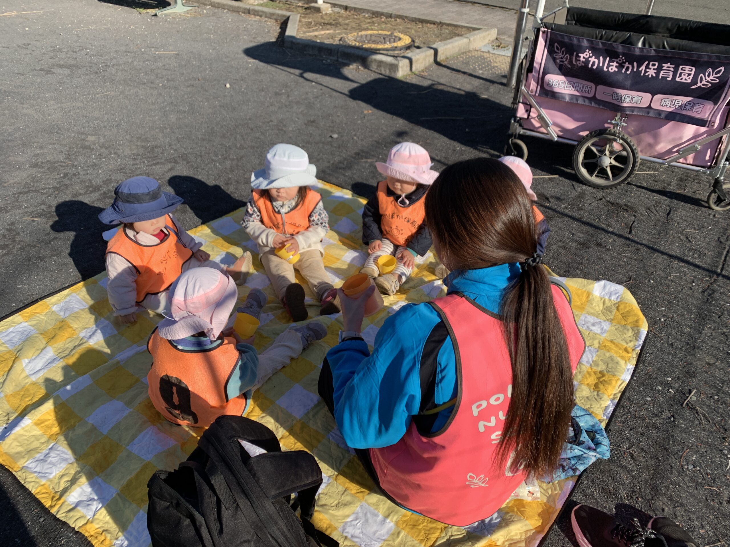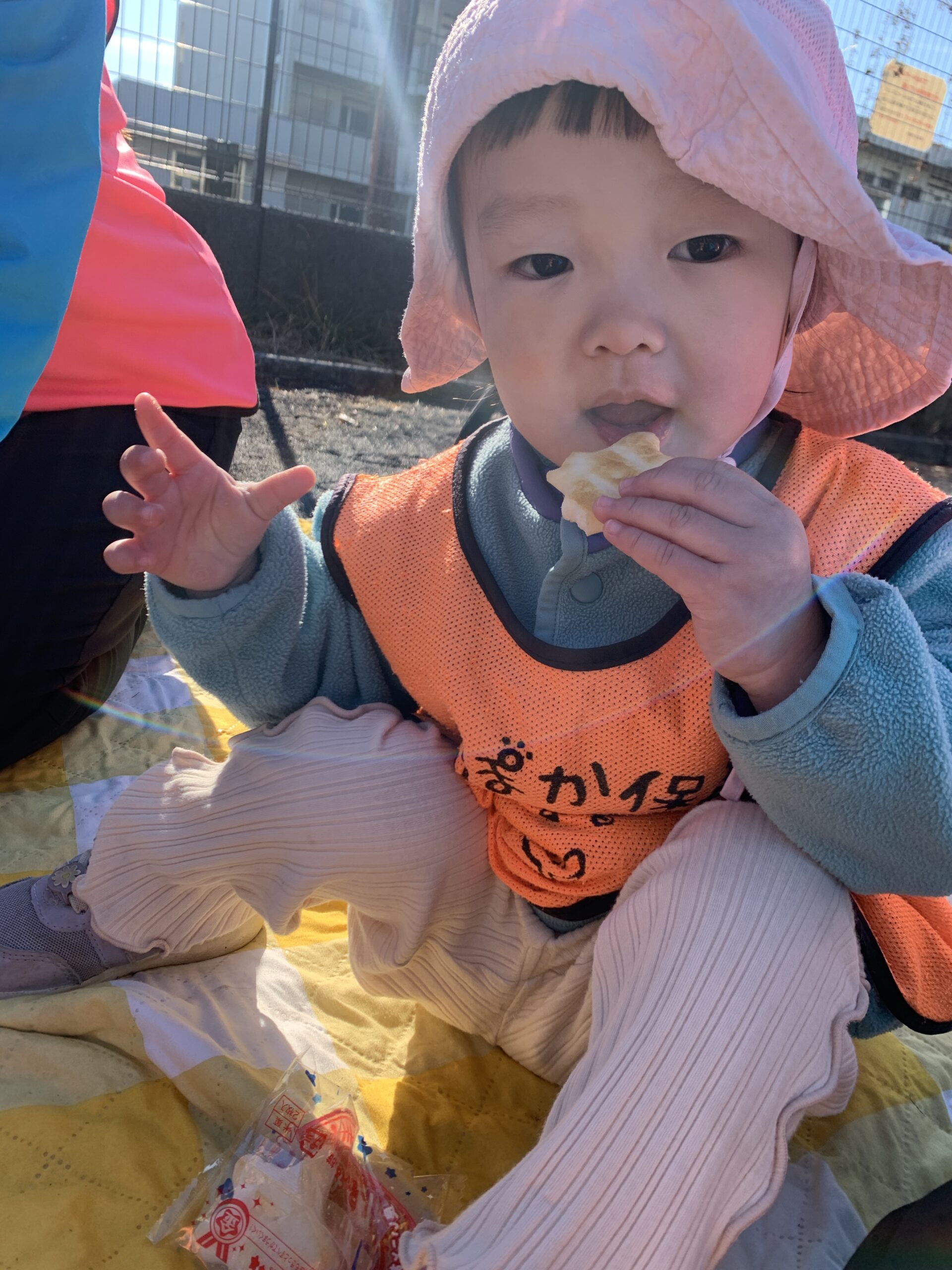 いつもは保育園の室内で食べる朝おやつですが、今日は特別!