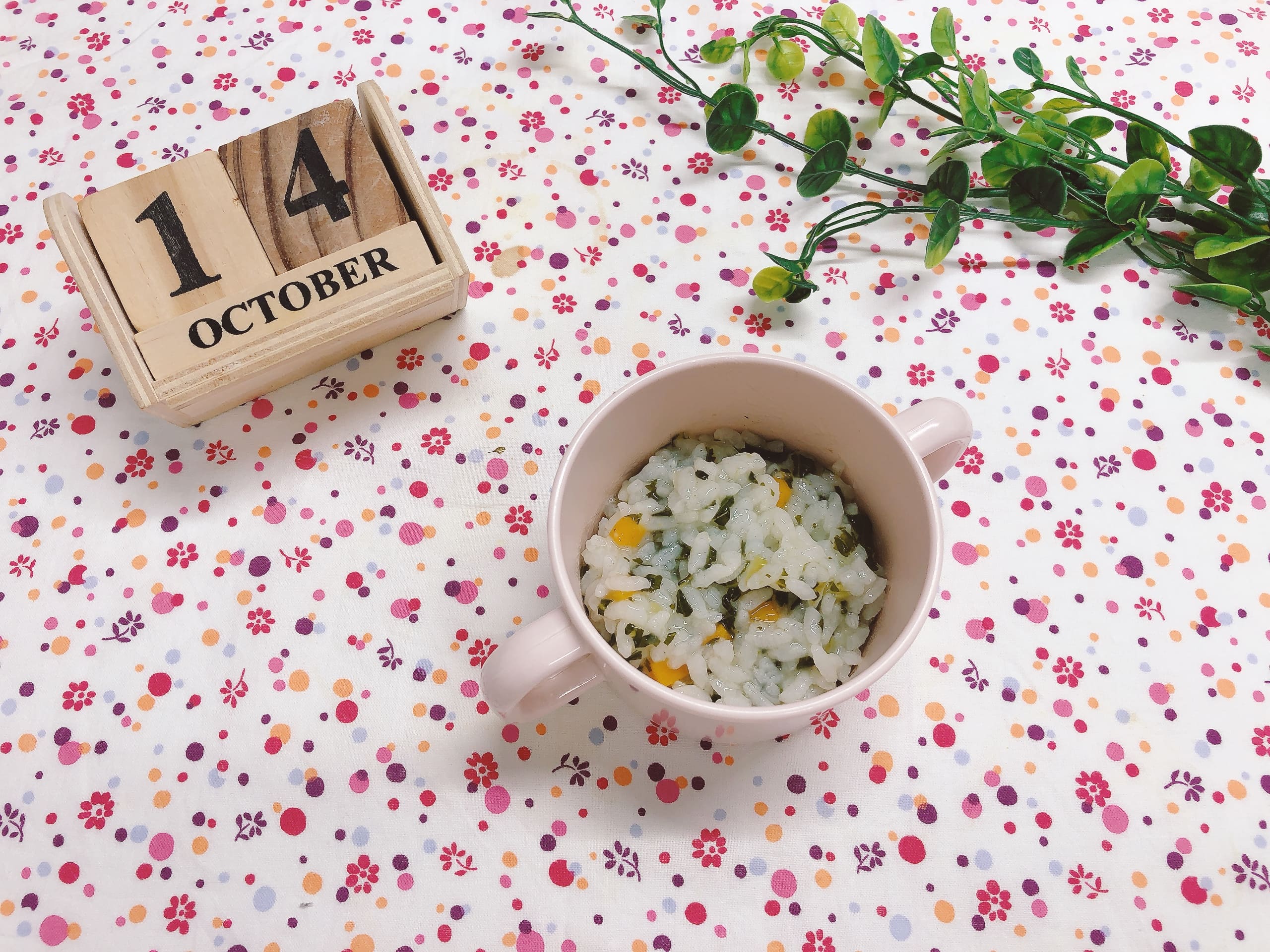 本日は鶏そぼろと小松菜の二色丼。小松菜は子どもでも食べやすいように小さくカットし、香りよく醤油で和えました。鶏そぼろは甘辛く仕上げ、二つの具材を並べるだけで彩り豊かな一皿に。