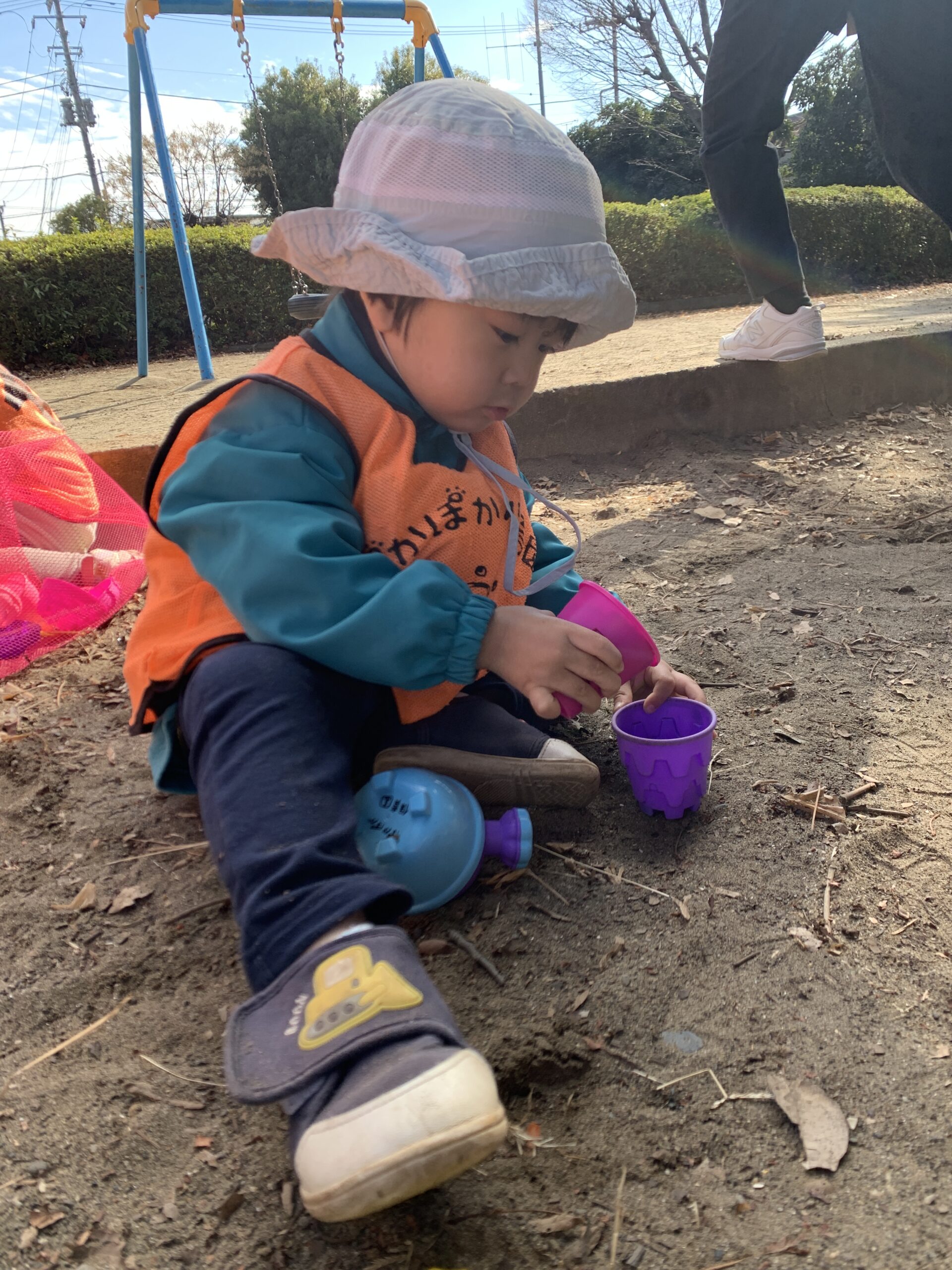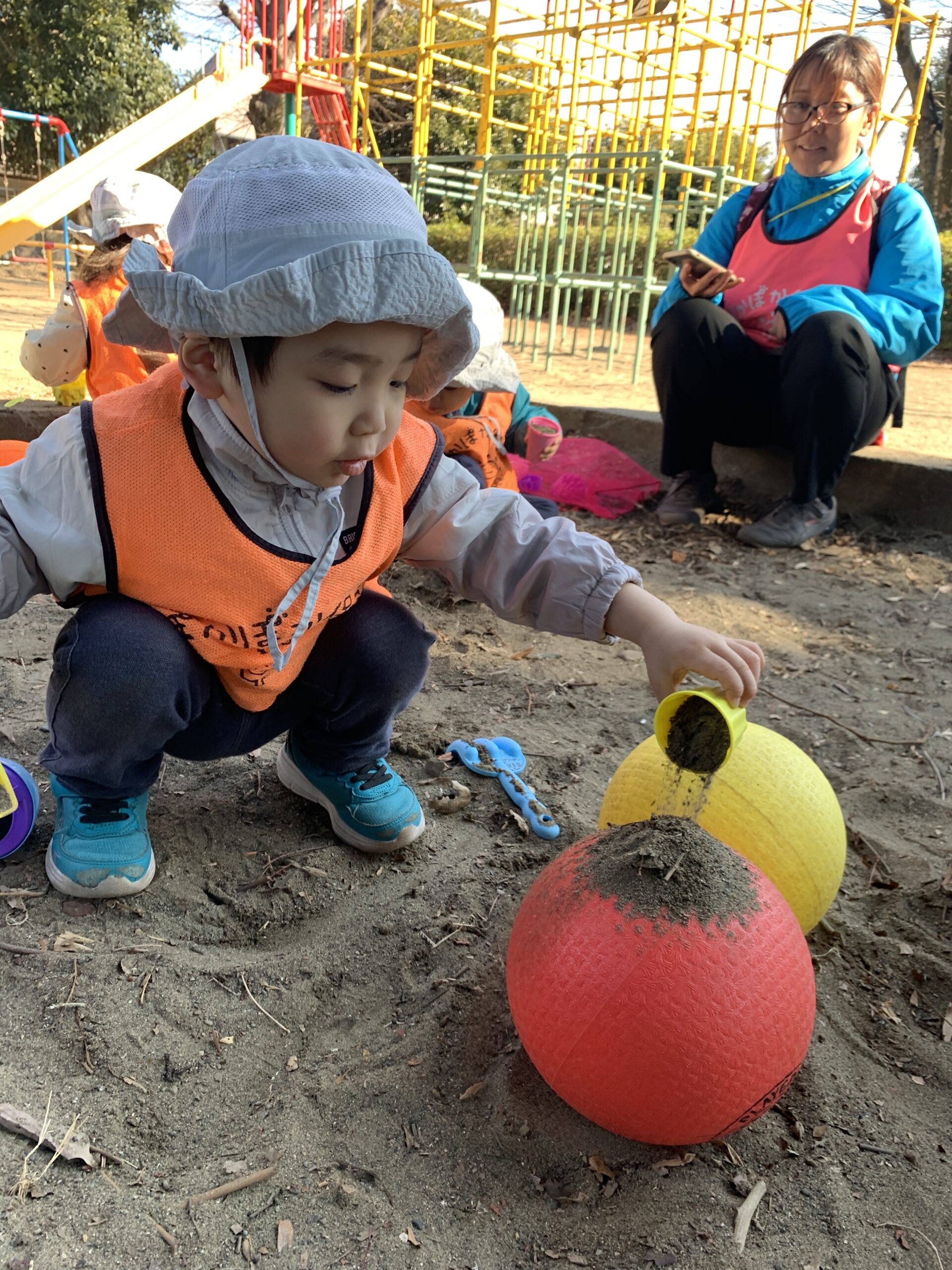 一方、青空組の子どもたちは、公園でお砂場セットを使って遊んだり、木の実を集めたりと、自然の中で五感を刺激する活動を楽しみました。