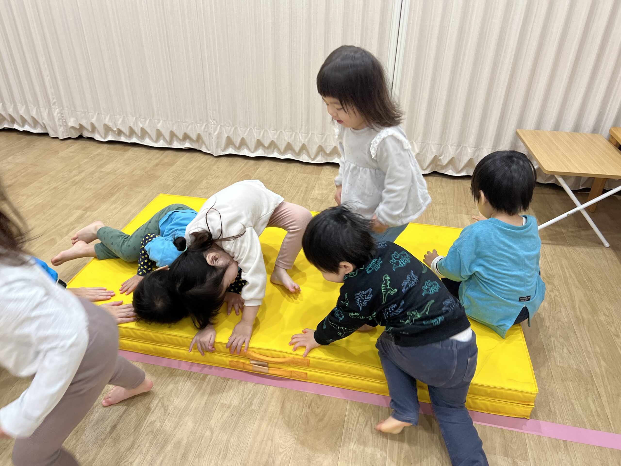 朝おやつの後、虹組の子どもたちは、まず安田式体育遊びに挑戦しました。