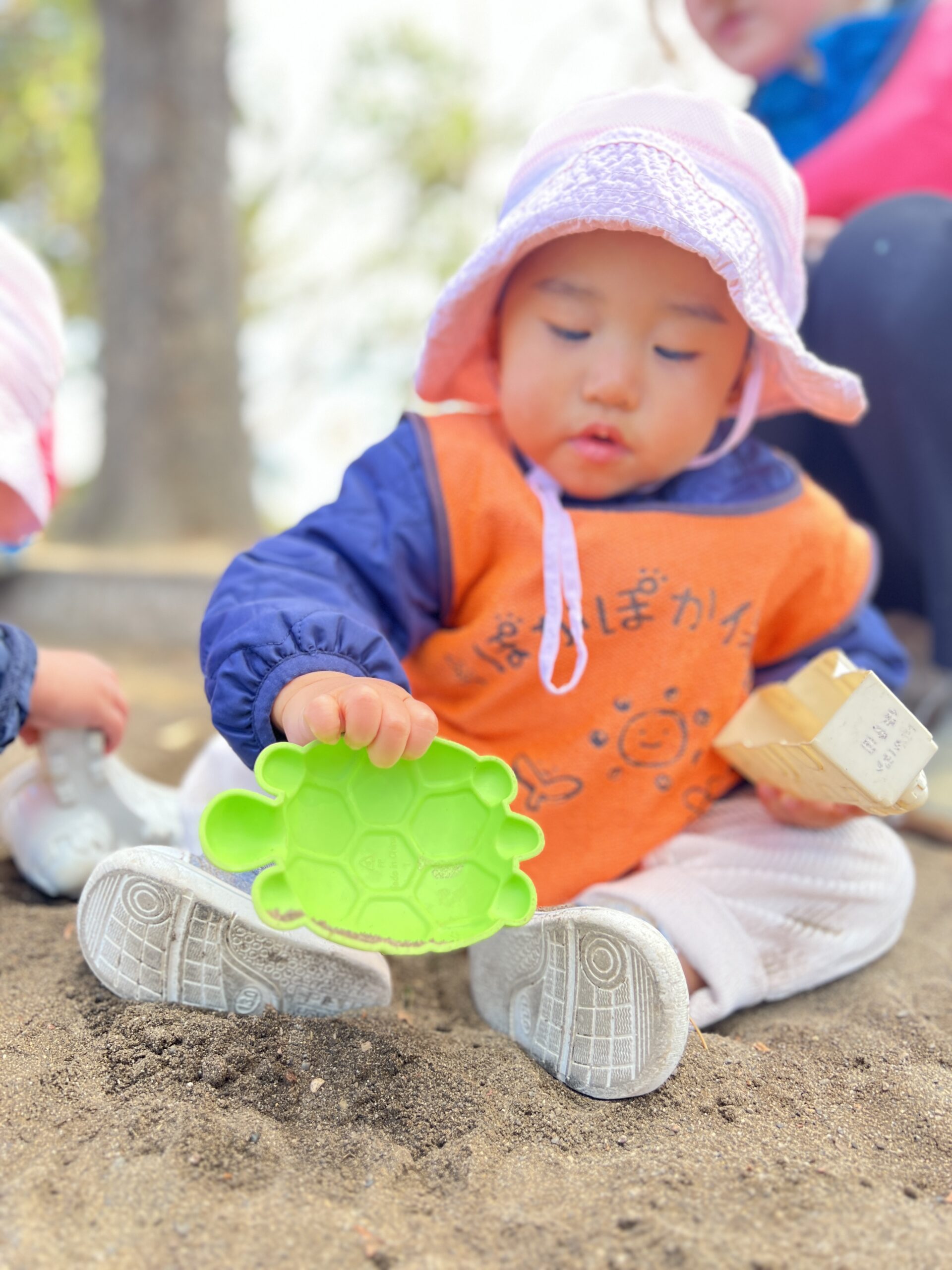 お砂場では、ひんやりとした砂の感触を味わいながら、スコップを使って砂を集めたりと、手や指先を使った遊びに集中していました。