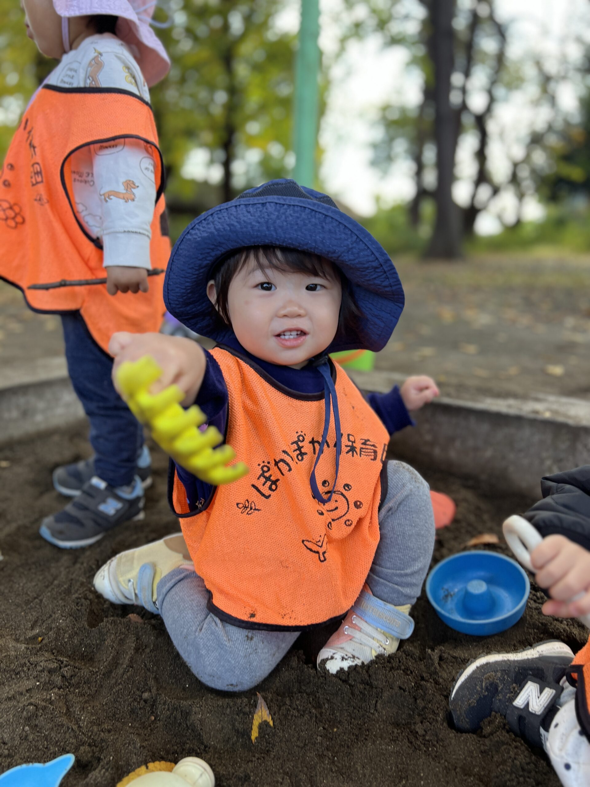 今日は砂場セットを使って、サラサラの砂を集めてみたり、スコップや型抜きで夢中になってお山や形を作ったりと、思い思いに楽しんでいました!秋ならではのどんぐり拾いも大人気!