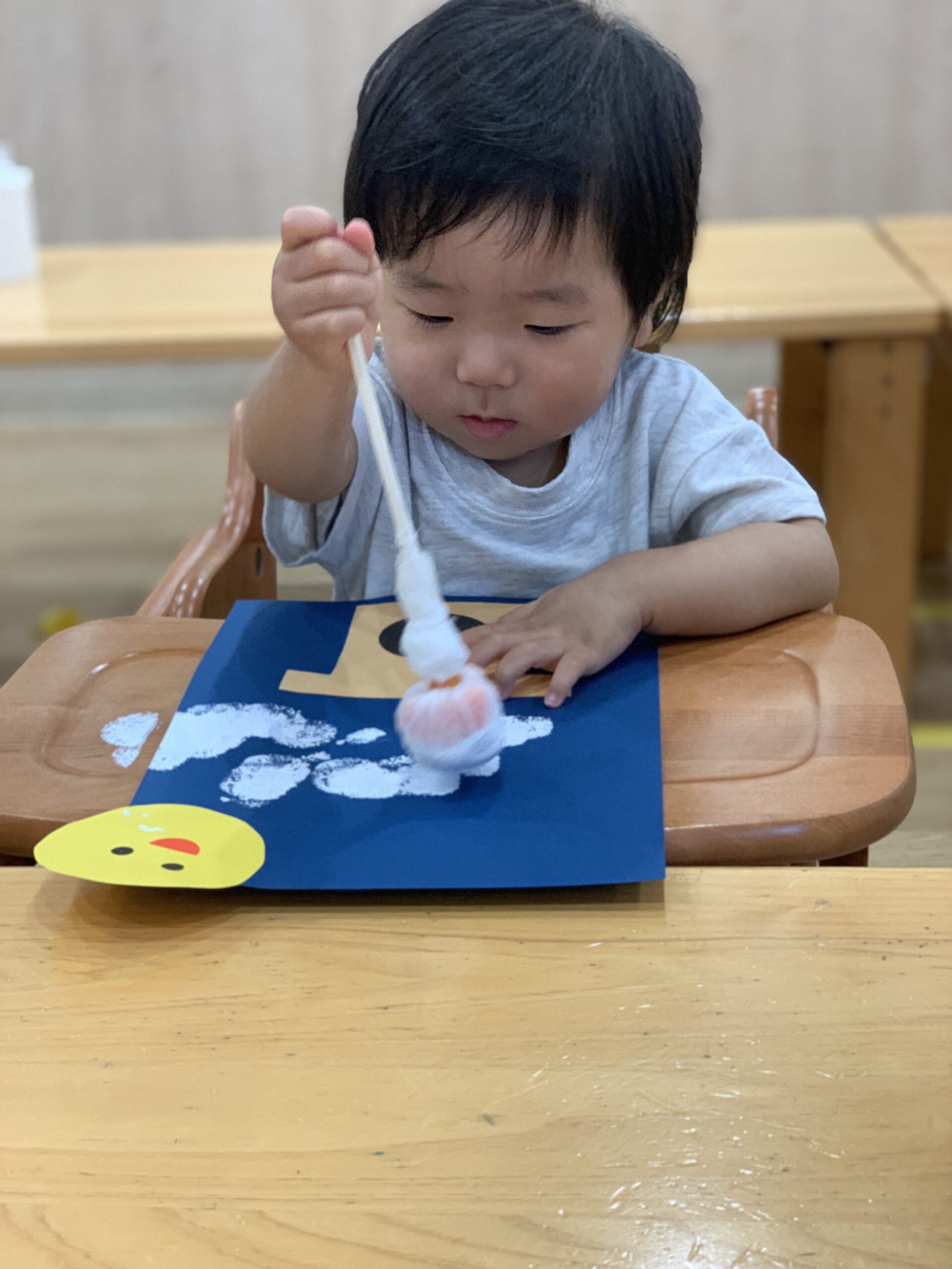 その後は9月の制作で、お月見のお餅をタンポを使って表現しました。ひとつひとつスタンプを押すように色をつけ、集中して取り組む姿が見られました。