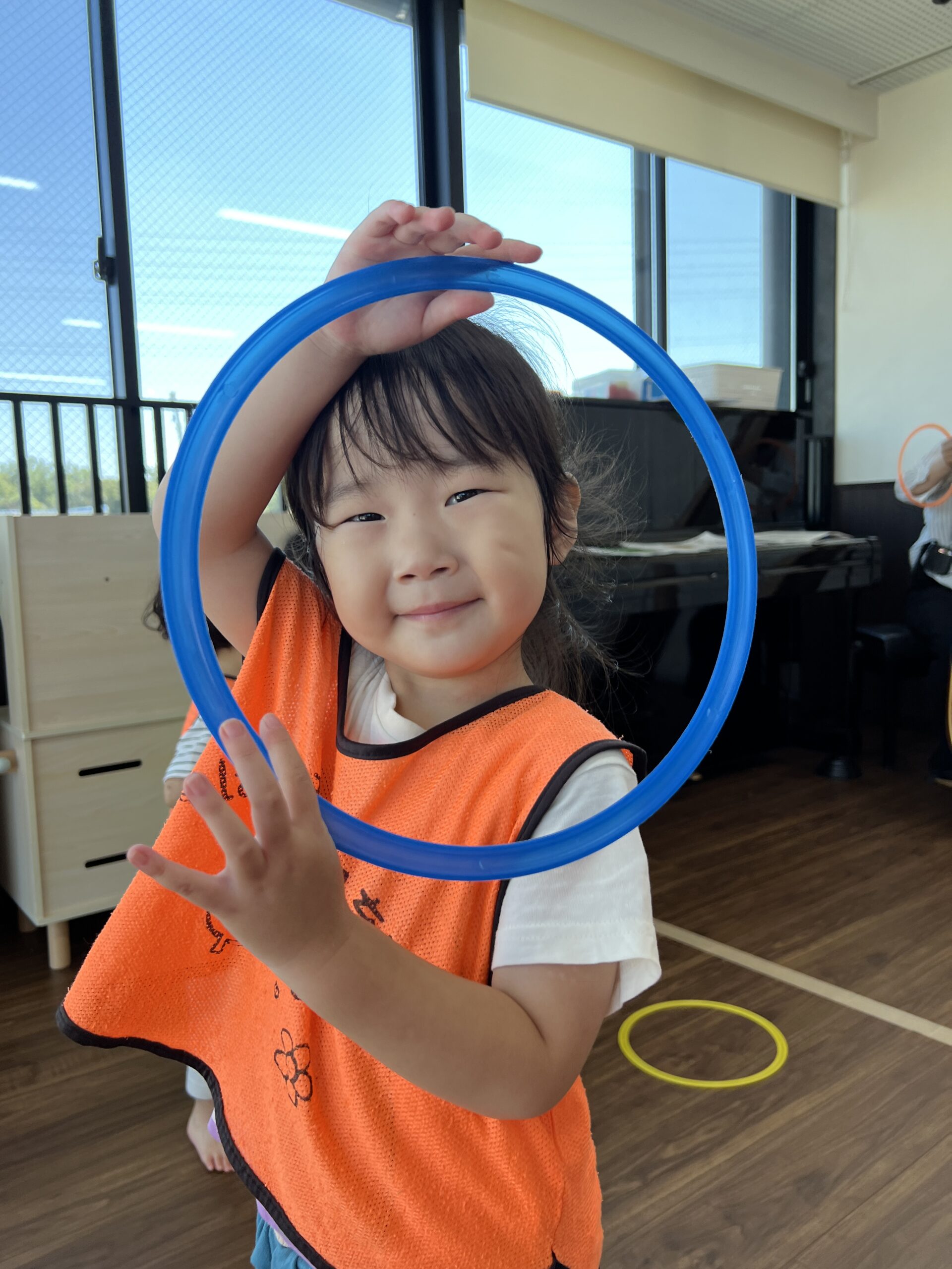 フラフープを車のハンドルに見立てて運転ごっこをしたり、色のマットを音楽に合わせて移動したりと、全身を使って音を感じていました。