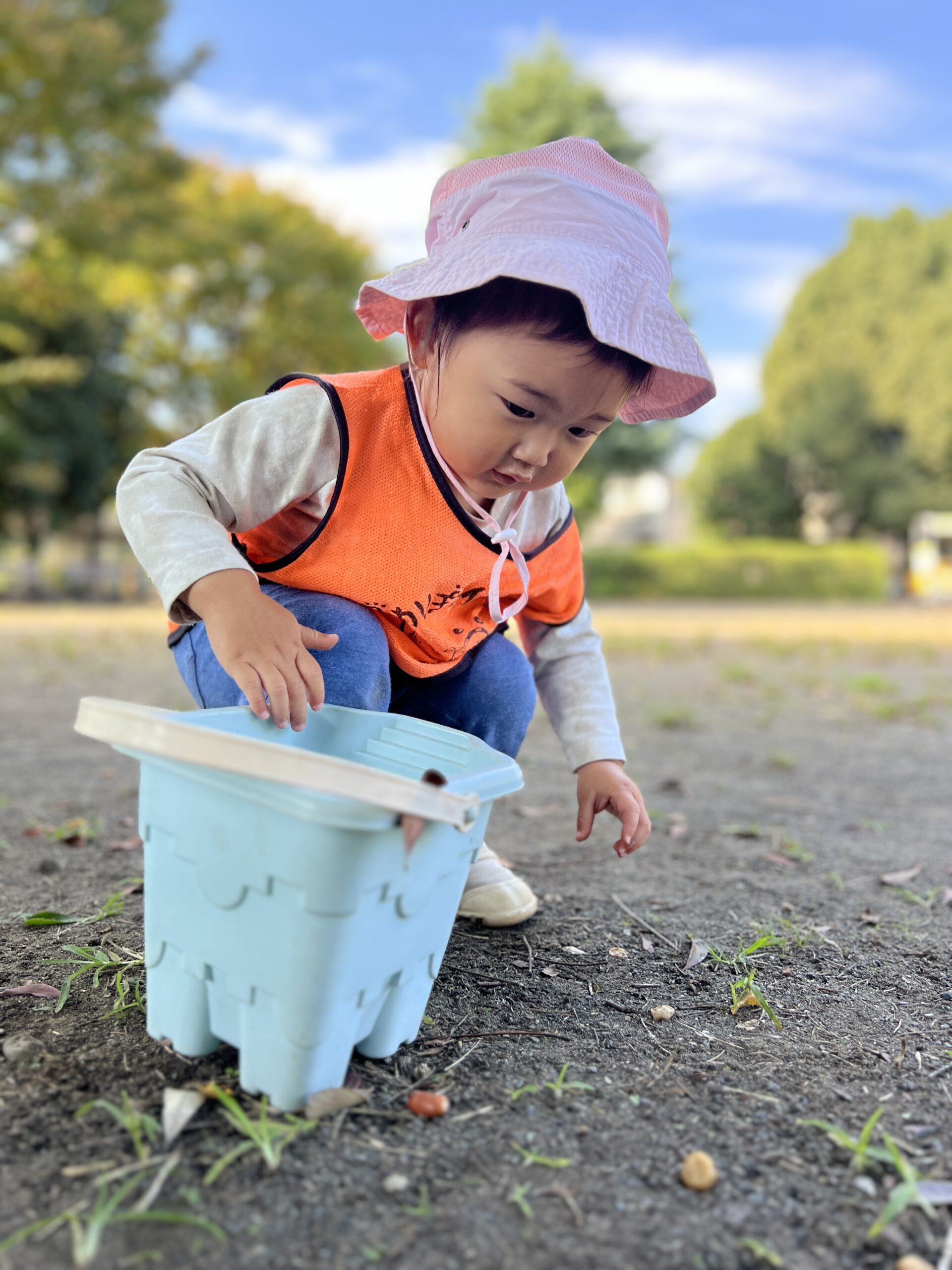 ゾウさんジョウロやバケツに拾ったどんぐりを入れて、「コロコロ♪」と音を楽しんだり、揺らして楽器のようにして遊んだりする姿もありました。