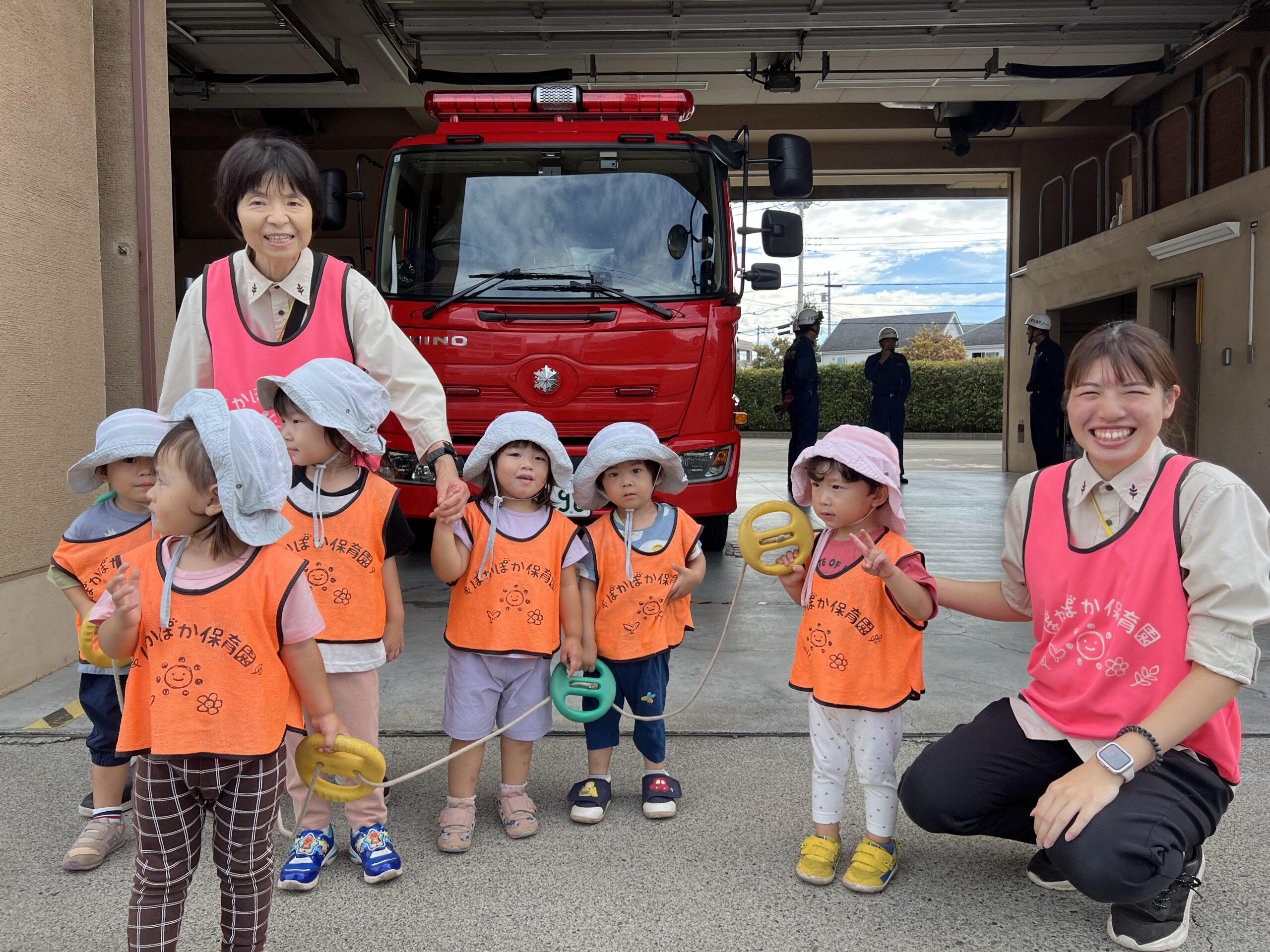 「かっこいい!」「おおきいね!」と大興奮で、消防車の前でみんなでニコニコ笑顔で記念撮影!