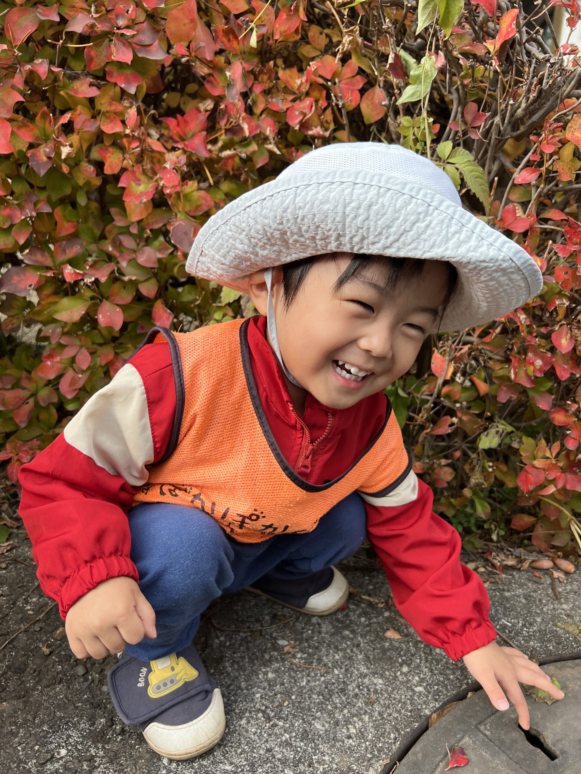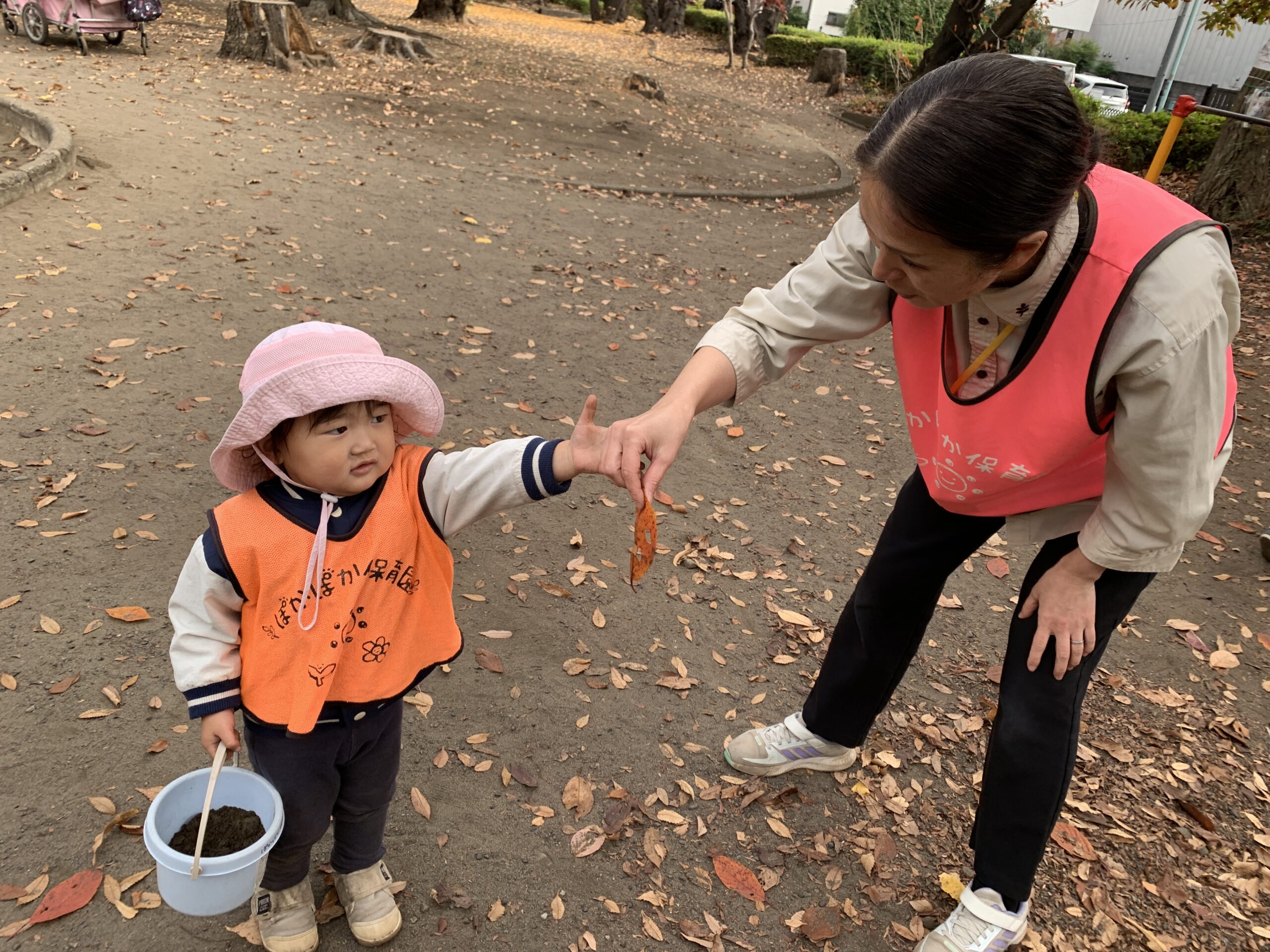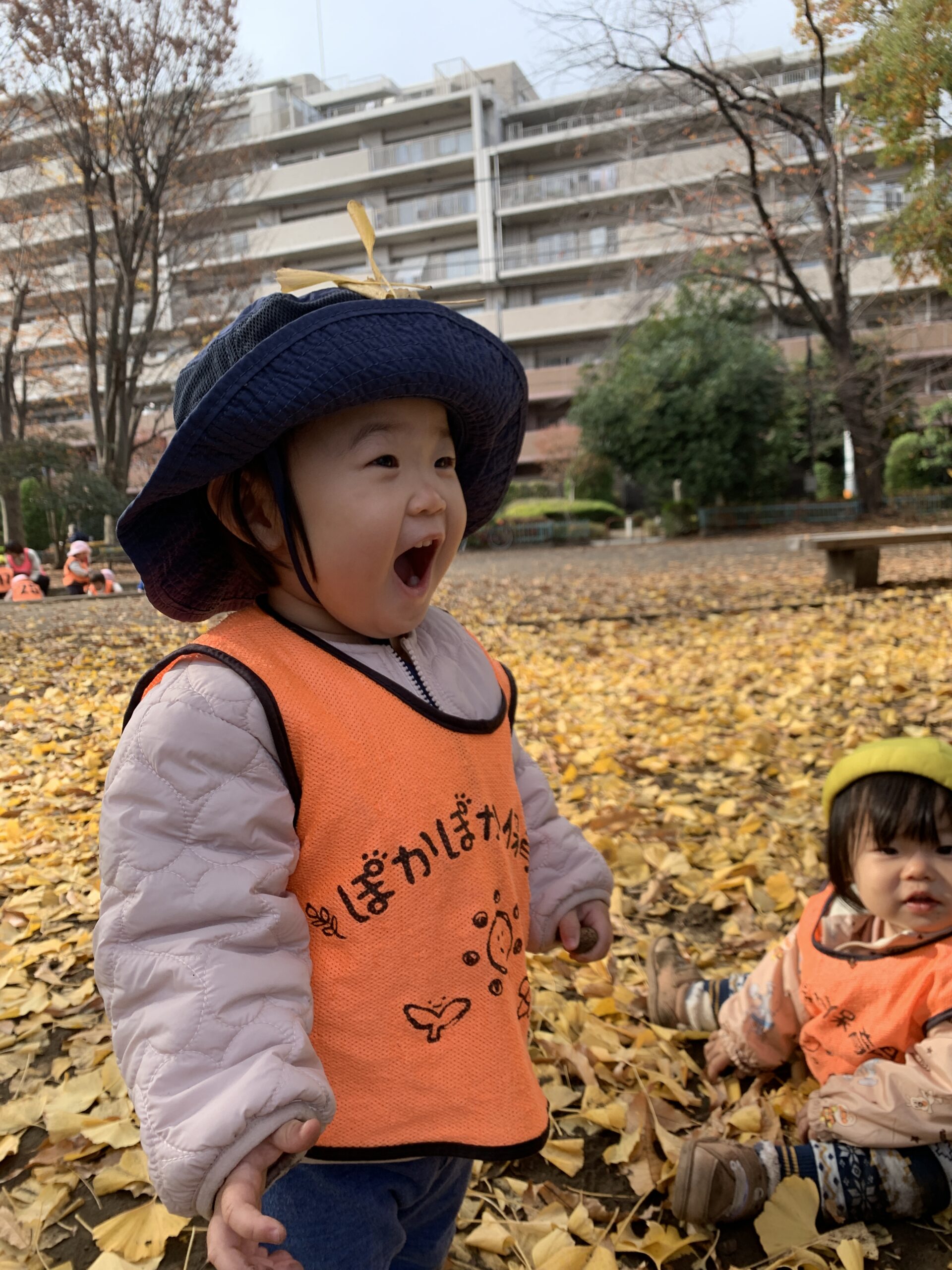 風に舞う葉っぱを追いかけたり、地面に広がる落ち葉を集めてパラパラと降らせてみたり、秋から冬へ移ろう季節を全身で感じながら遊びました。