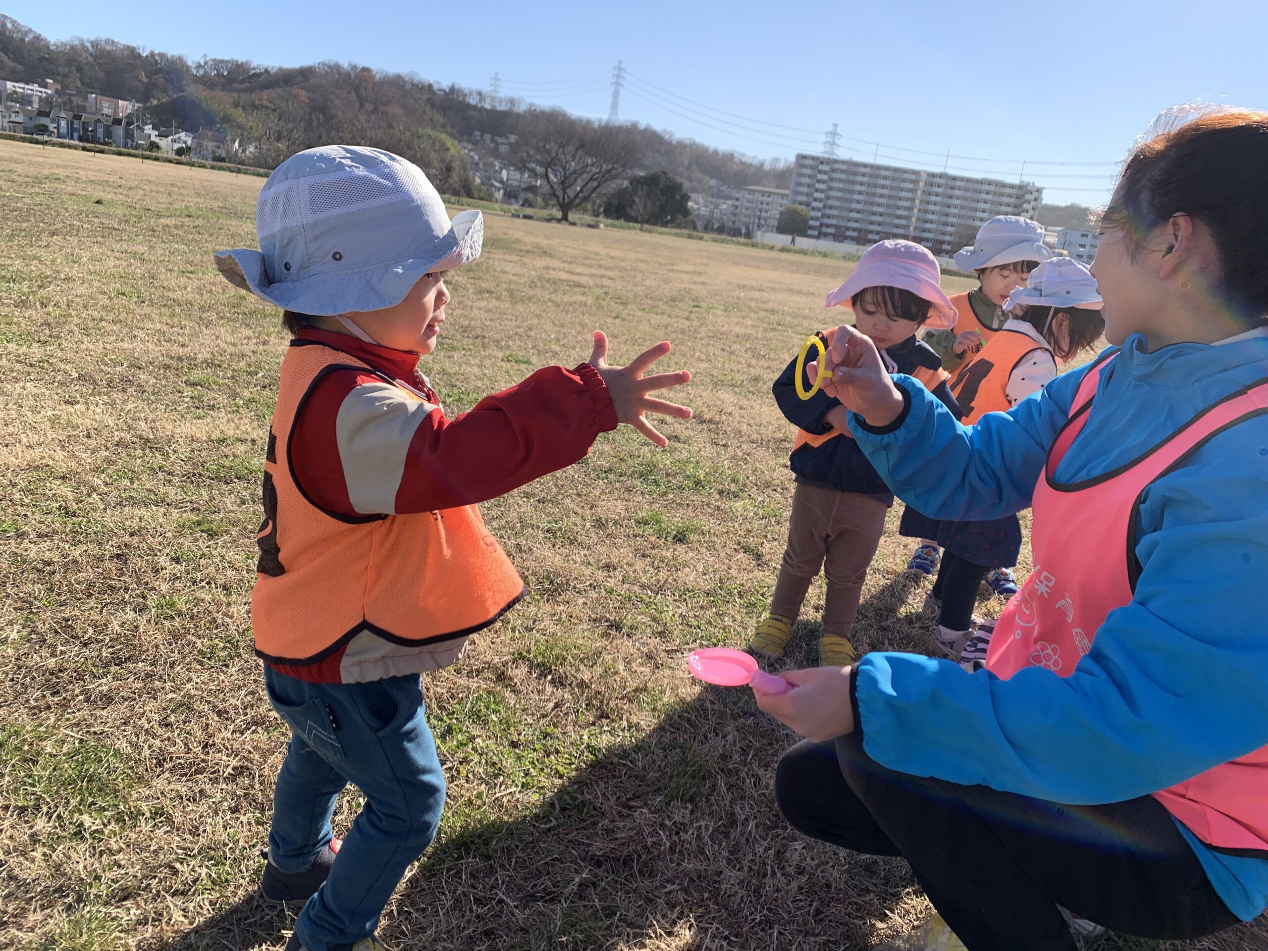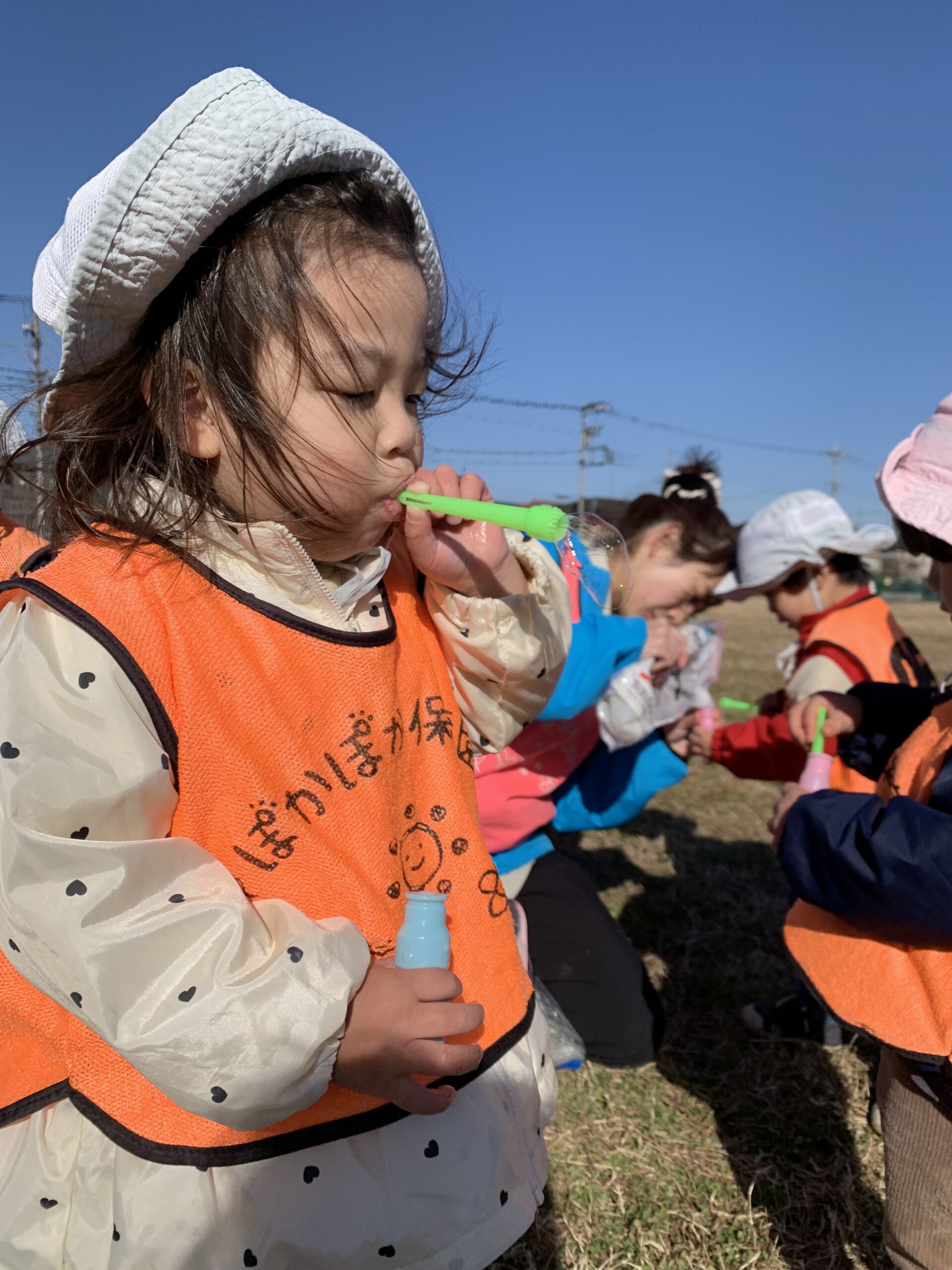 虹組はシャボン玉で遊び、大きな風に乗って空へ飛んでいくシャボン玉を見て大喜び。