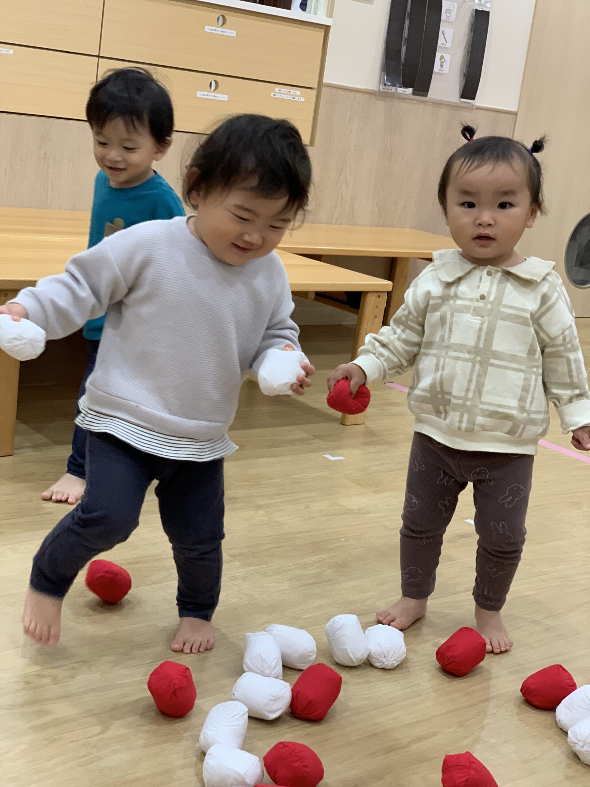 続いては、運動会に向けて玉入れの練習!音楽に合わせてボールを投げるテンポ遊びを取り入れ、自然と身体を動かすリズム感やチームで協力する楽しさを感じていました。