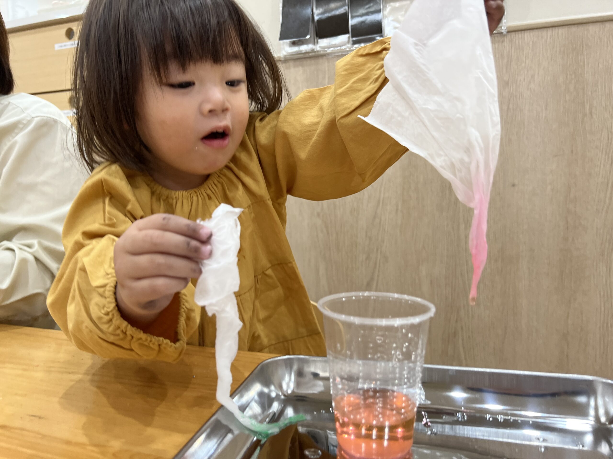 まずは、クレヨンで色を塗ったティッシュと、水性ペンで色をつけたティッシュをそれぞれ水に浸し、色の変化を観察しました。