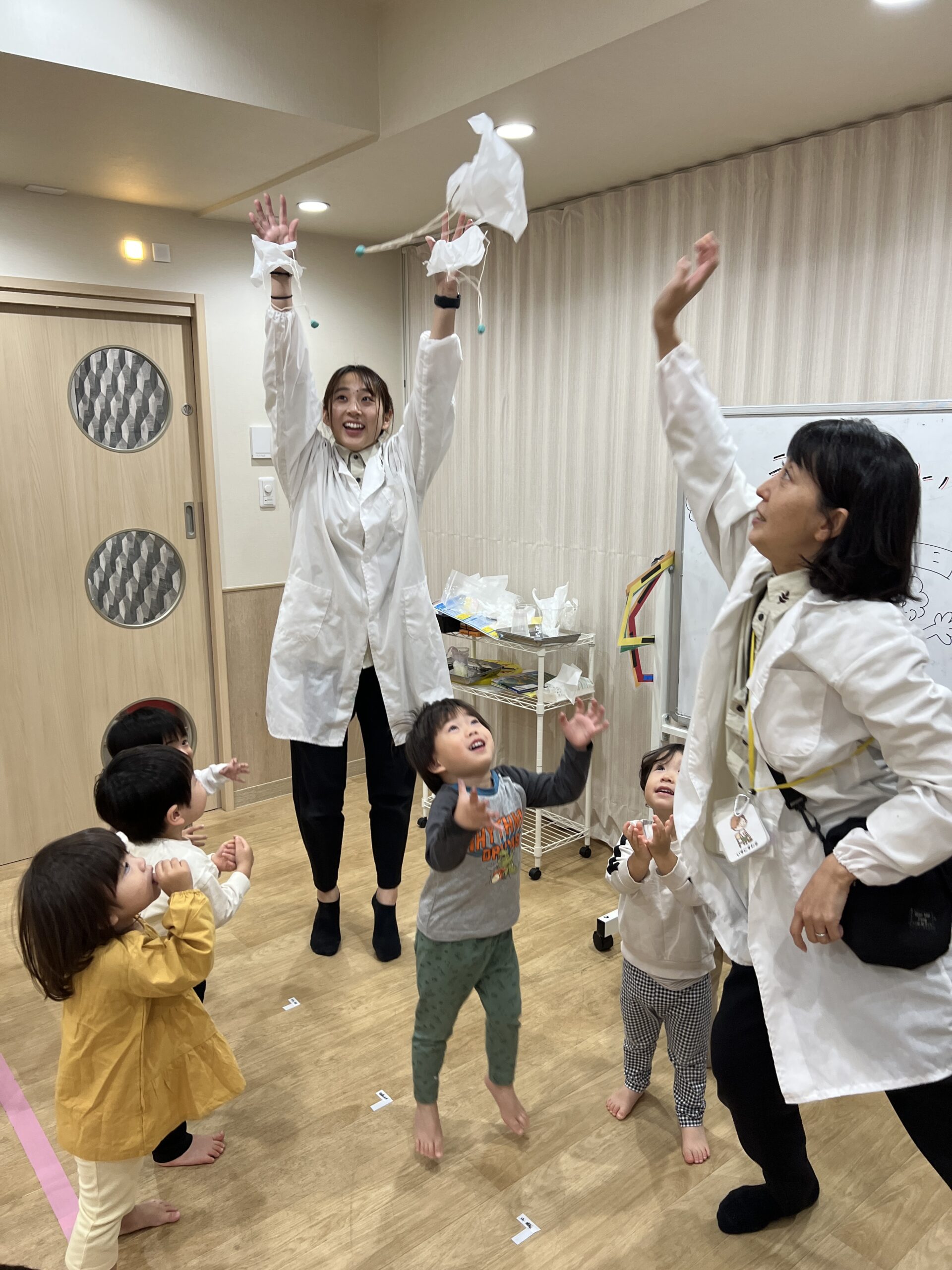 最後は、ティッシュに粘土とひもをつけてパラシュートを作り、空中に投げてキャッチ!風にふわりと舞いながら落ちるティッシュの動きを夢中で追いかけていました♡