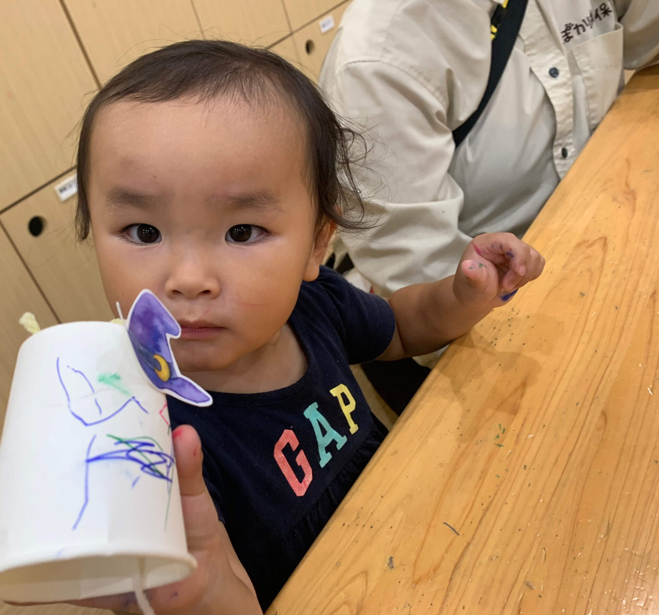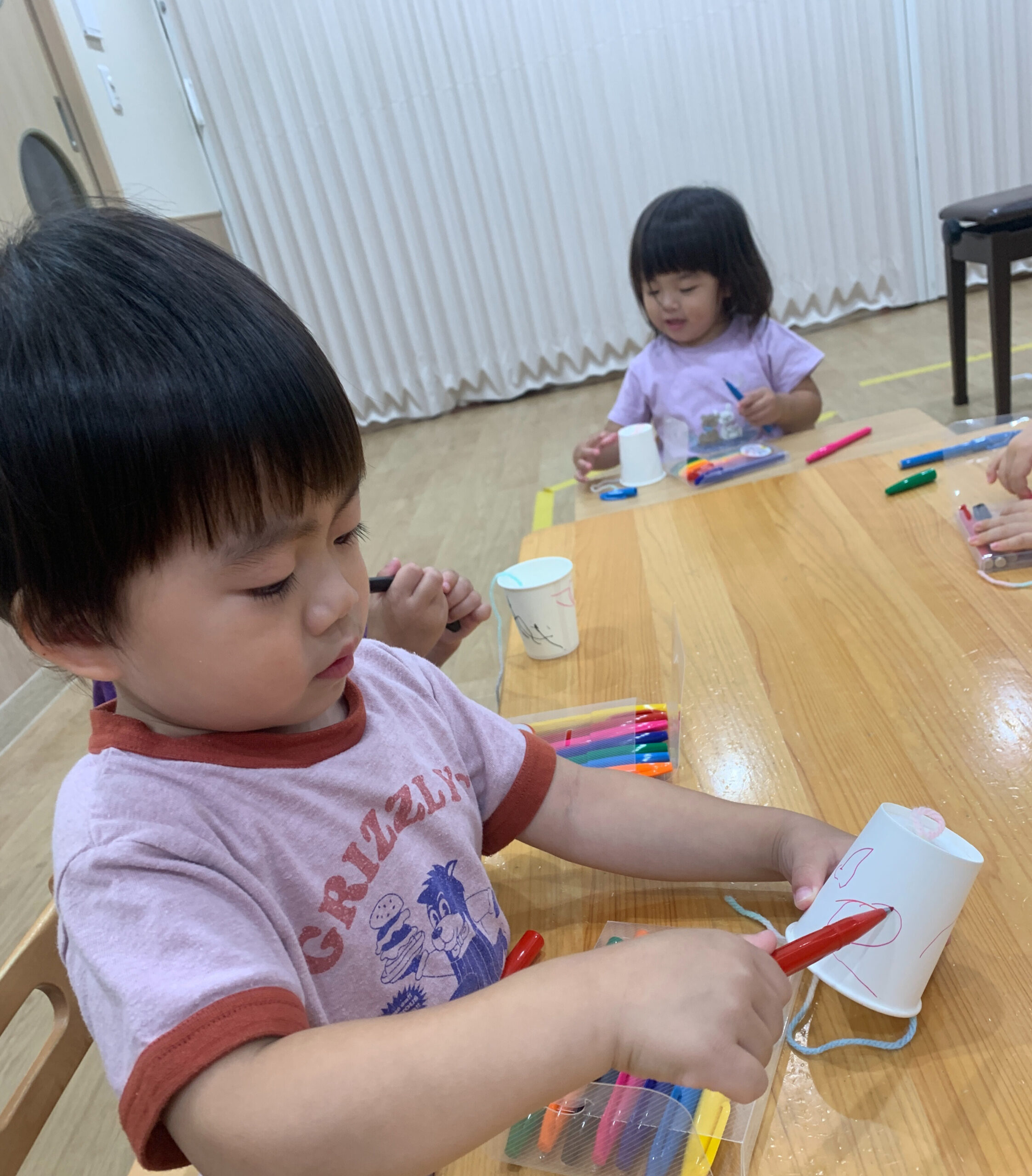 音楽遊びのあとは、ハロウィンに向けた制作活動です。紙コップにカラーペンで自由にお絵描きをし、思い思いの模様や表情を描きました。