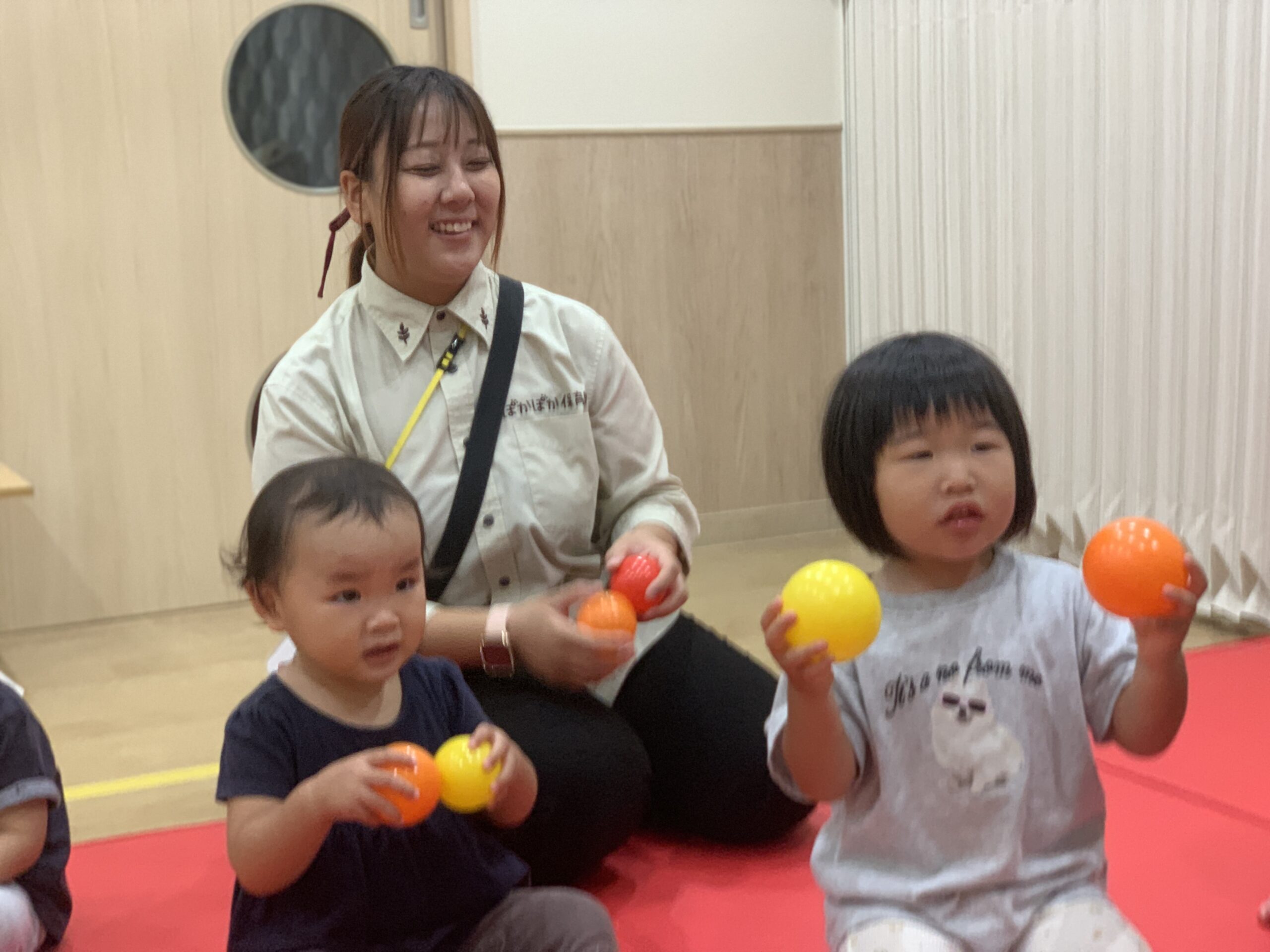 今日は青空組と虹組合同で音楽遊びを楽しみました!季節にちなんだ「どんぐりころころ」を、カラーボールをどんぐりに見立てながら元気いっぱいに歌いました。実際に手の中でコロコロ転がしてみることで、歌の世界がより身近に感じられます。