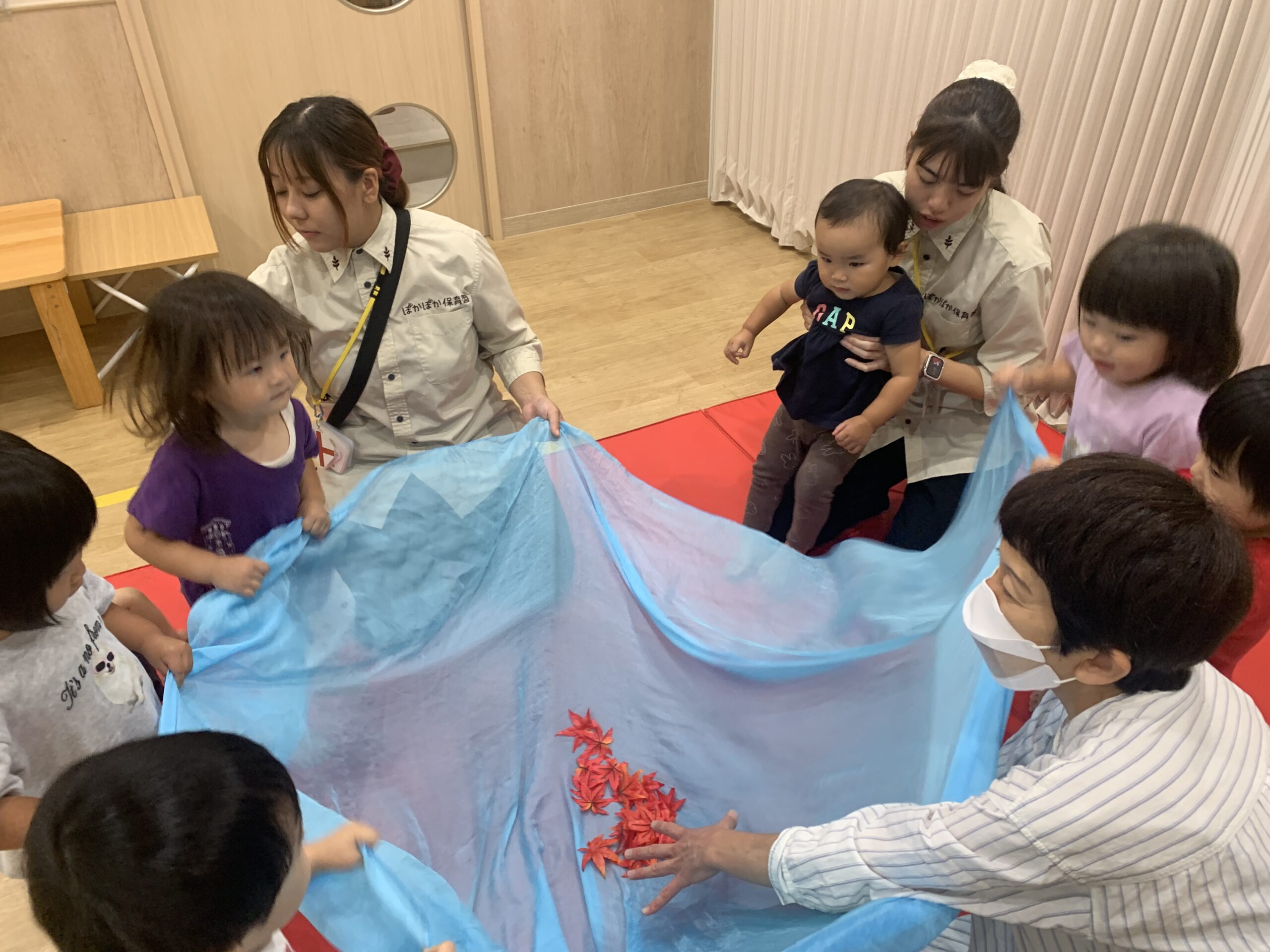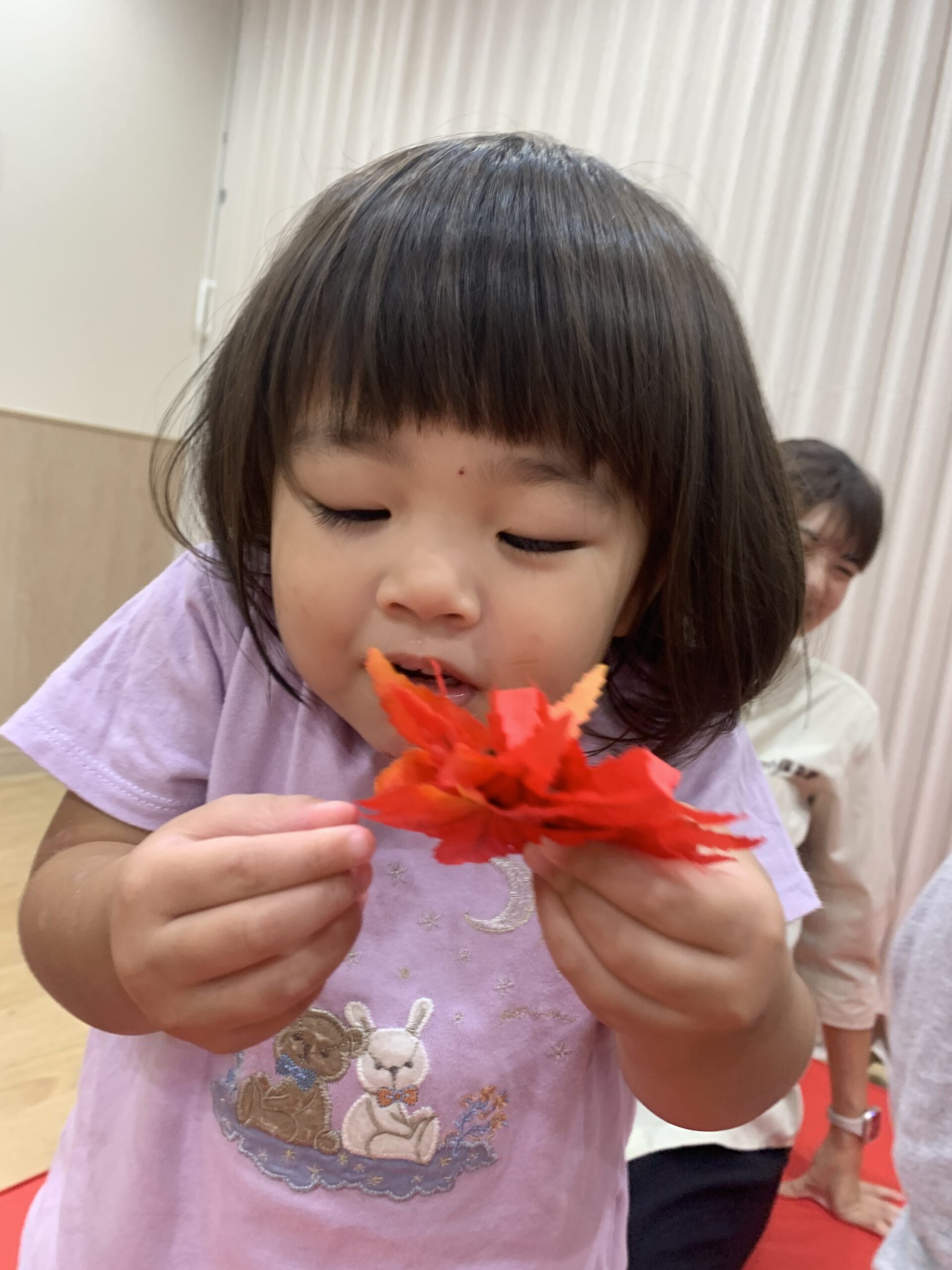 「まっかなあき」の歌では、大きなスカーフをみんなで持ち、ひらひらと舞わせて秋風のような動きを楽しみました。音楽に合わせてスカーフがふわっと広がるたびに、子どもたちの目はキラキラ。先生たちも一緒に盛り上がり、音楽と体を使った遊びの魅力があふれる時間になりました。