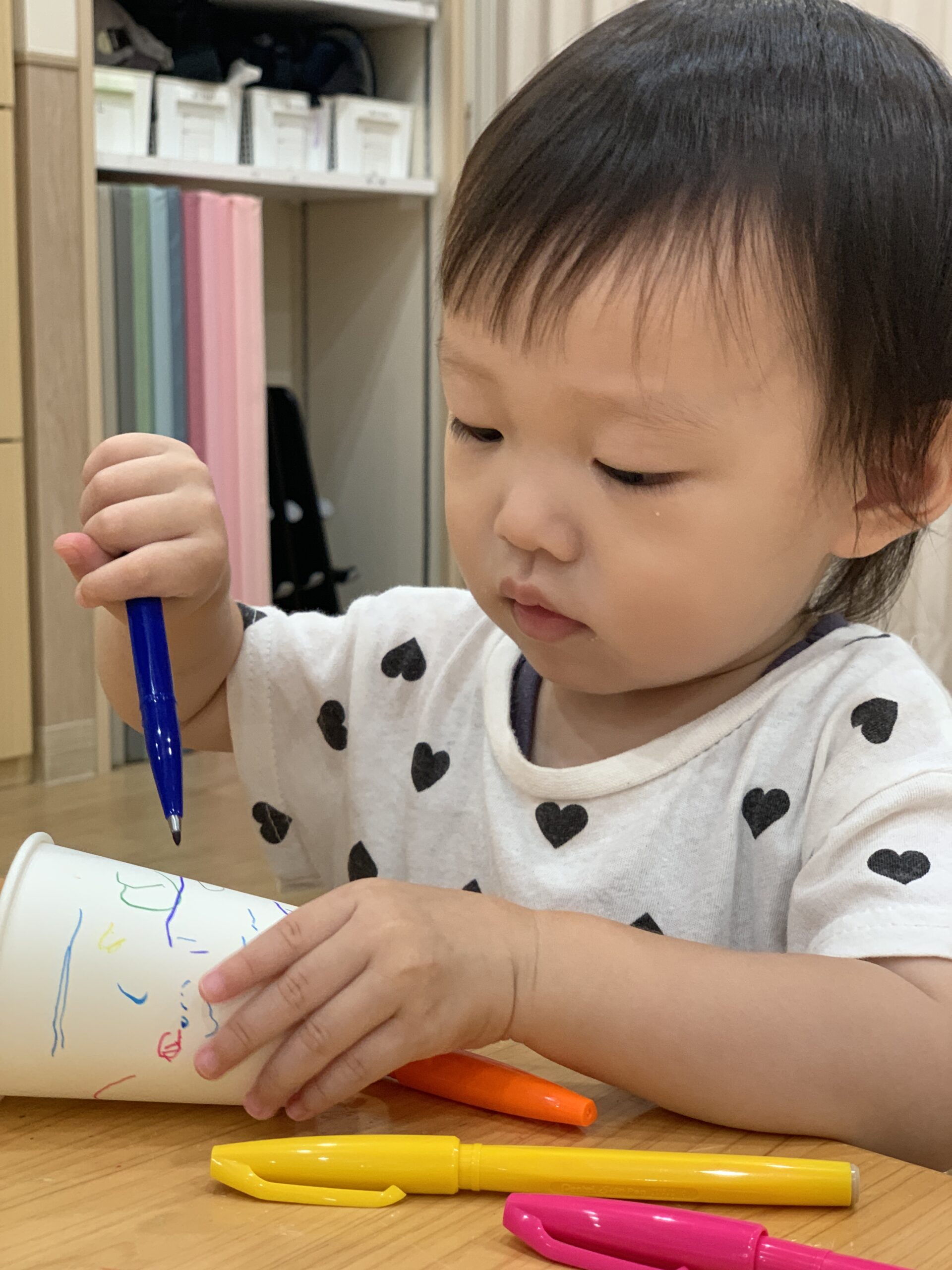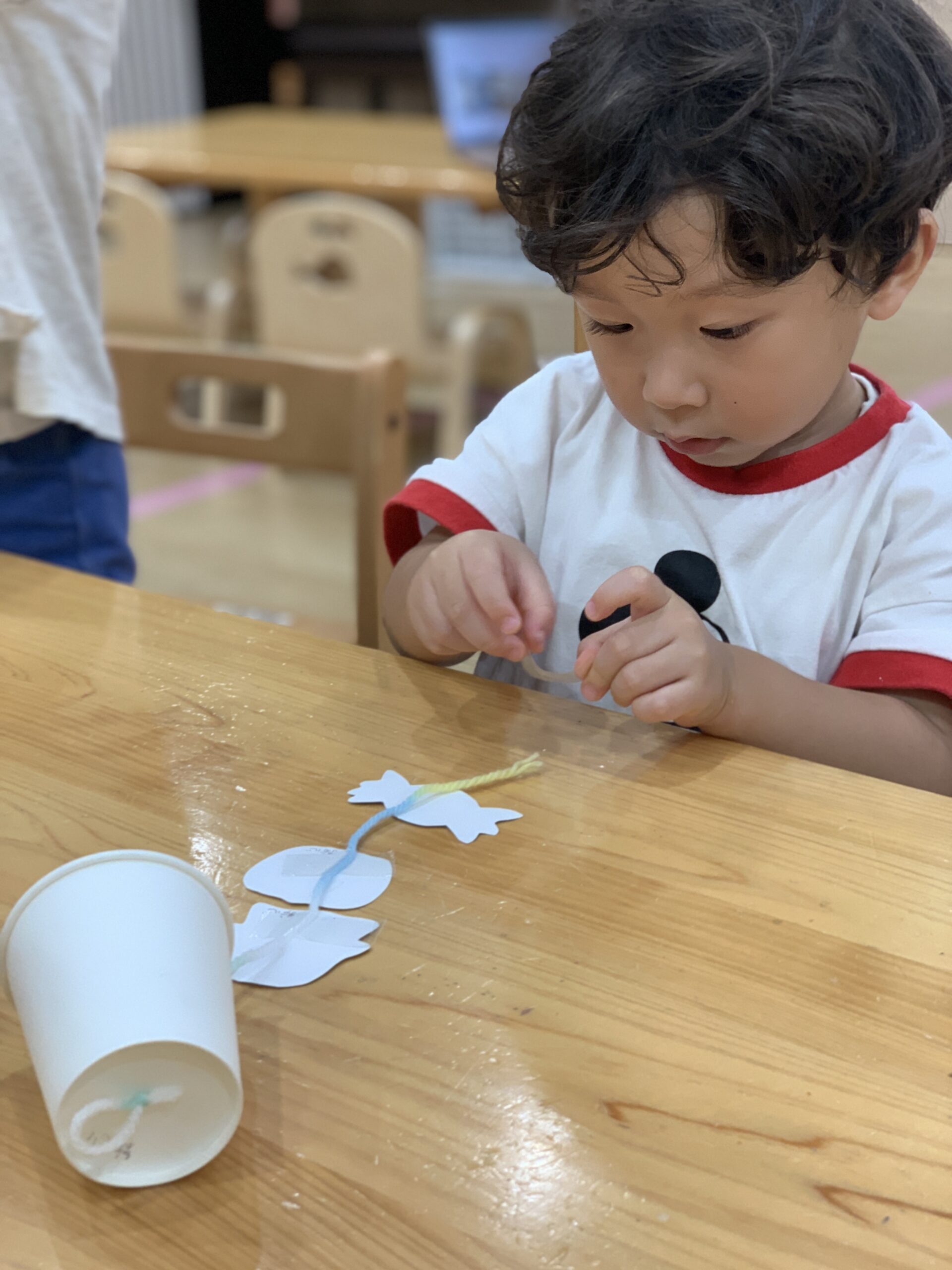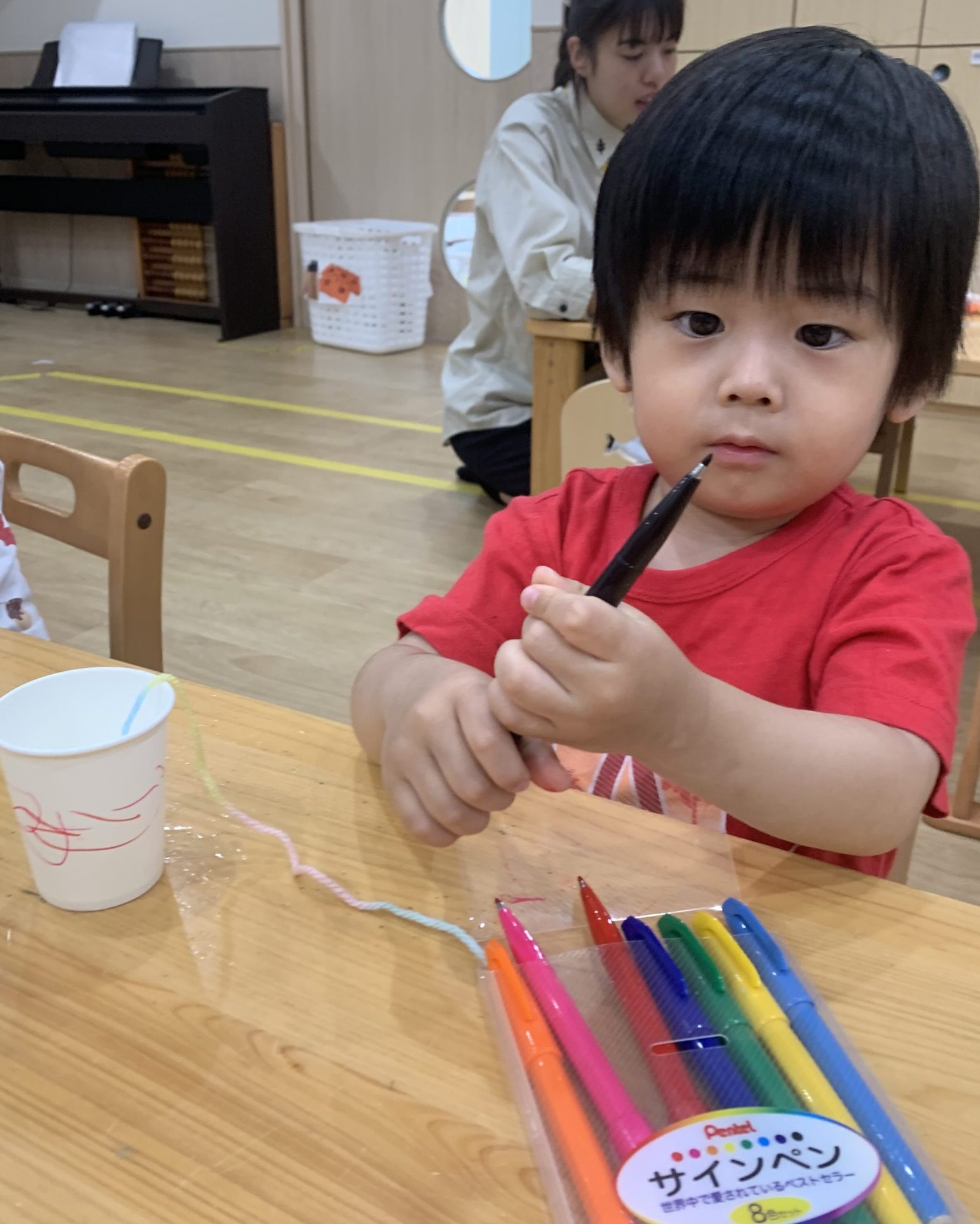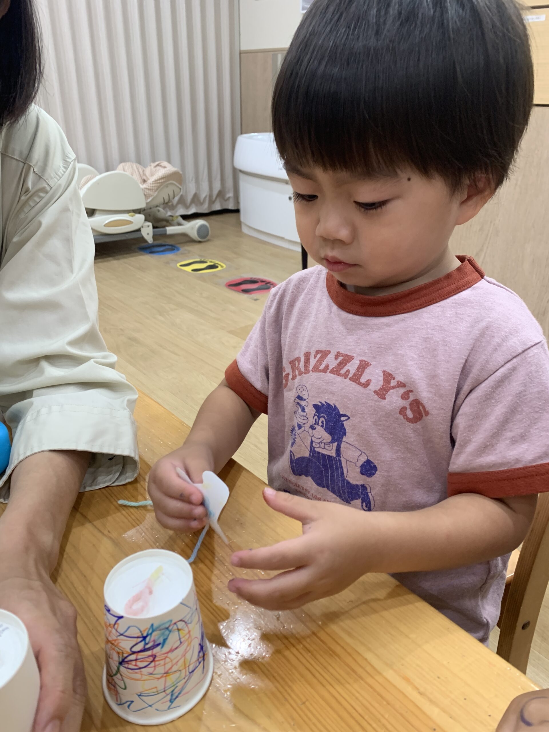 「おばけ!」という言葉を口にしながら、笑顔で制作に取り組む子どもたち。紙コップにクレヨンで模様を描いたり、シールを貼ったりして、思い思いの“おばけさん”を作り上げました♬