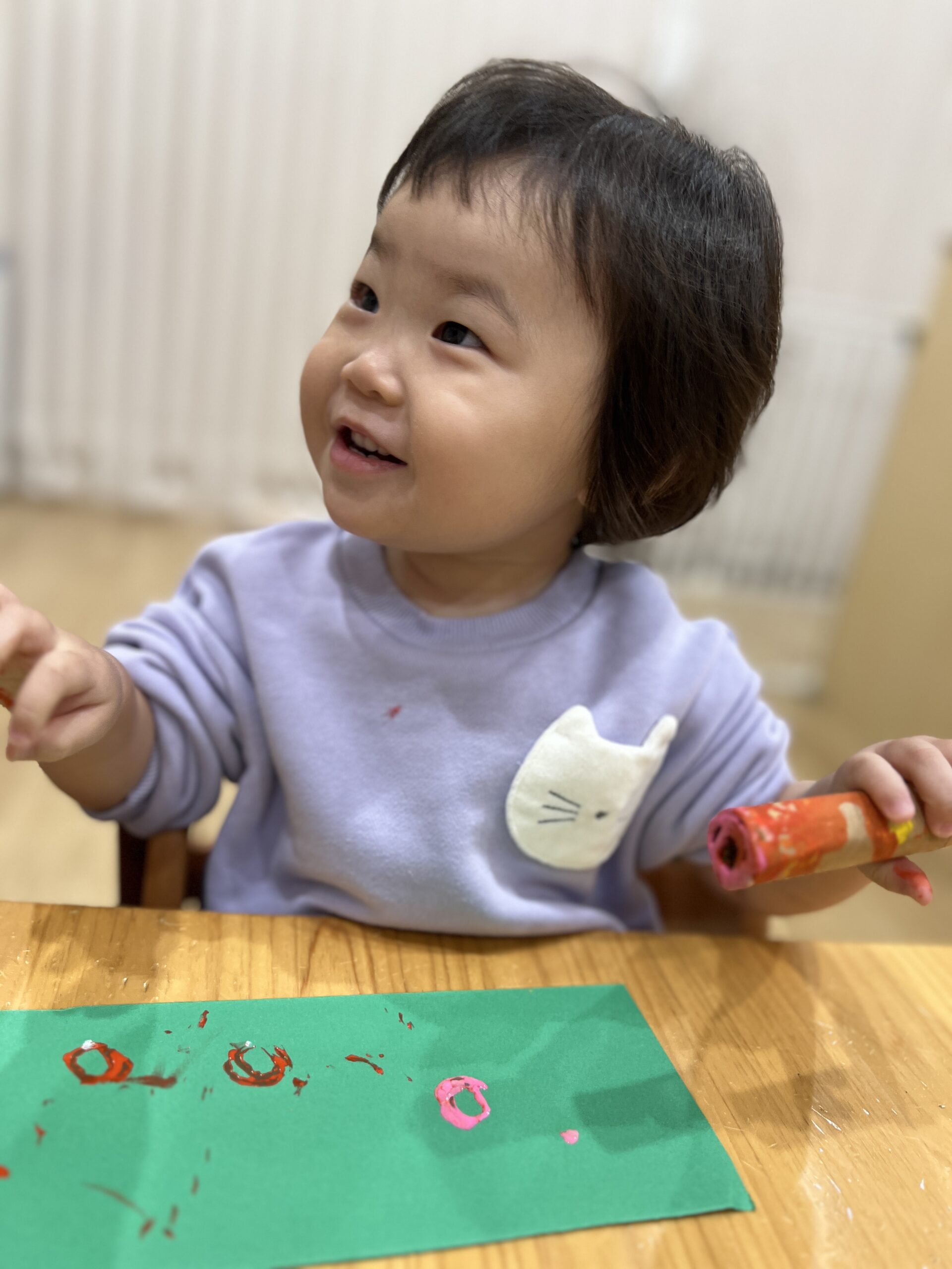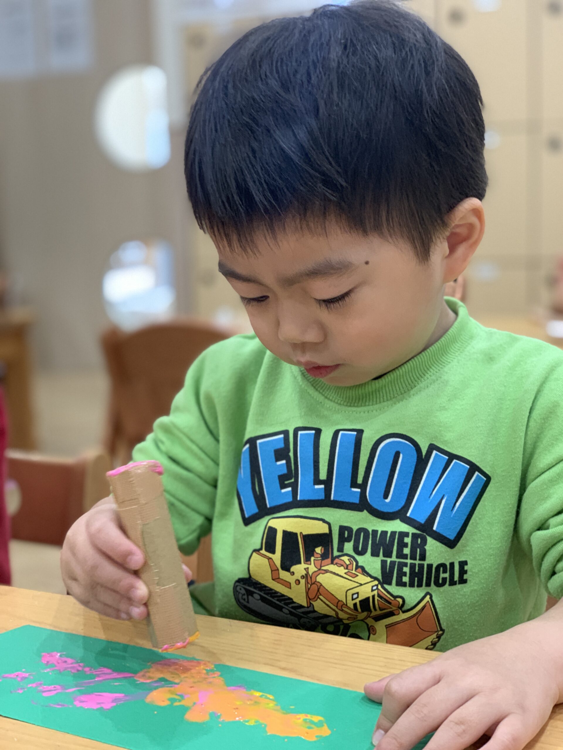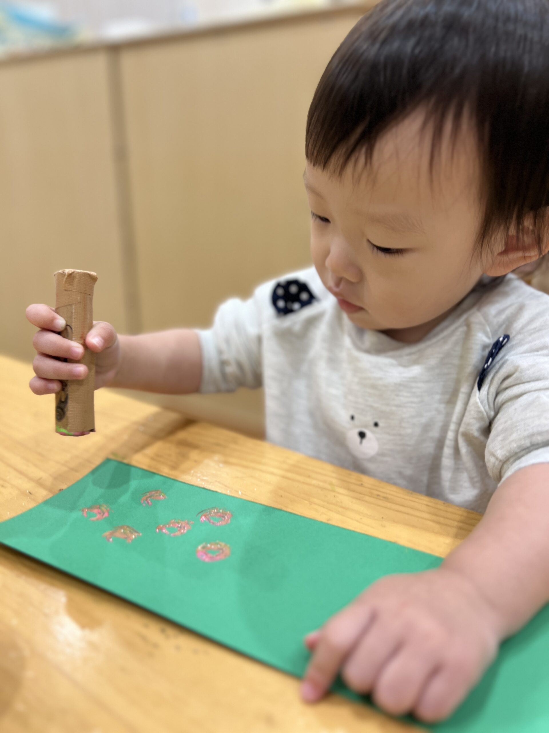 《1歳児の様子》~集中力と工夫する楽しさ、ダンボールスタンプで表現~