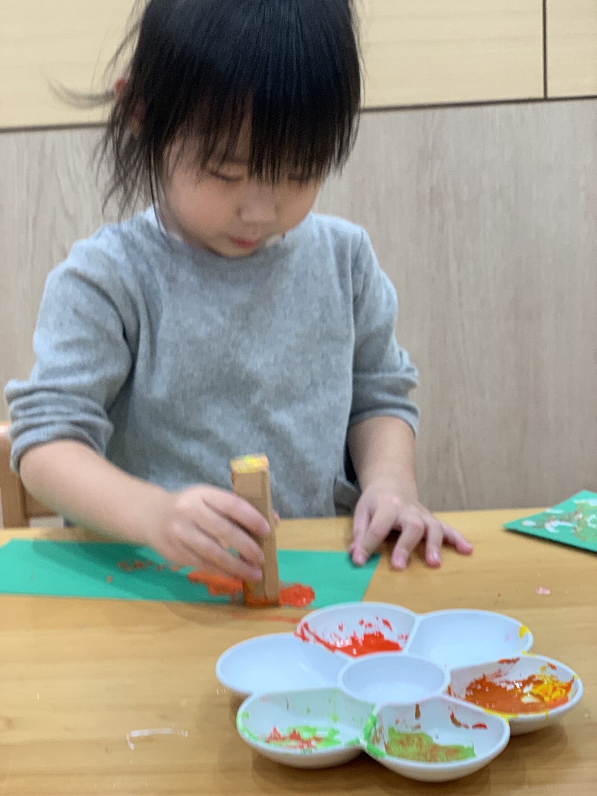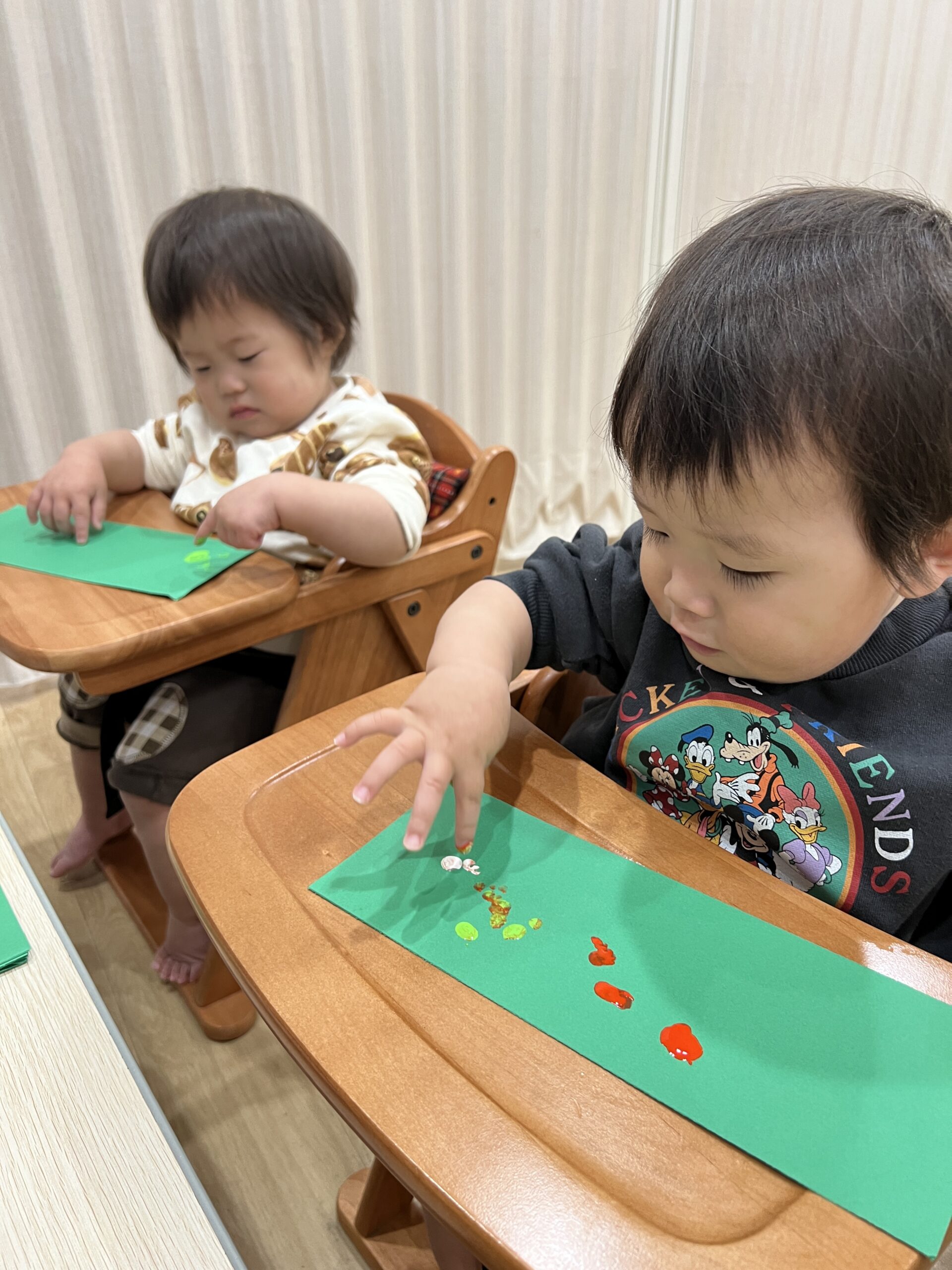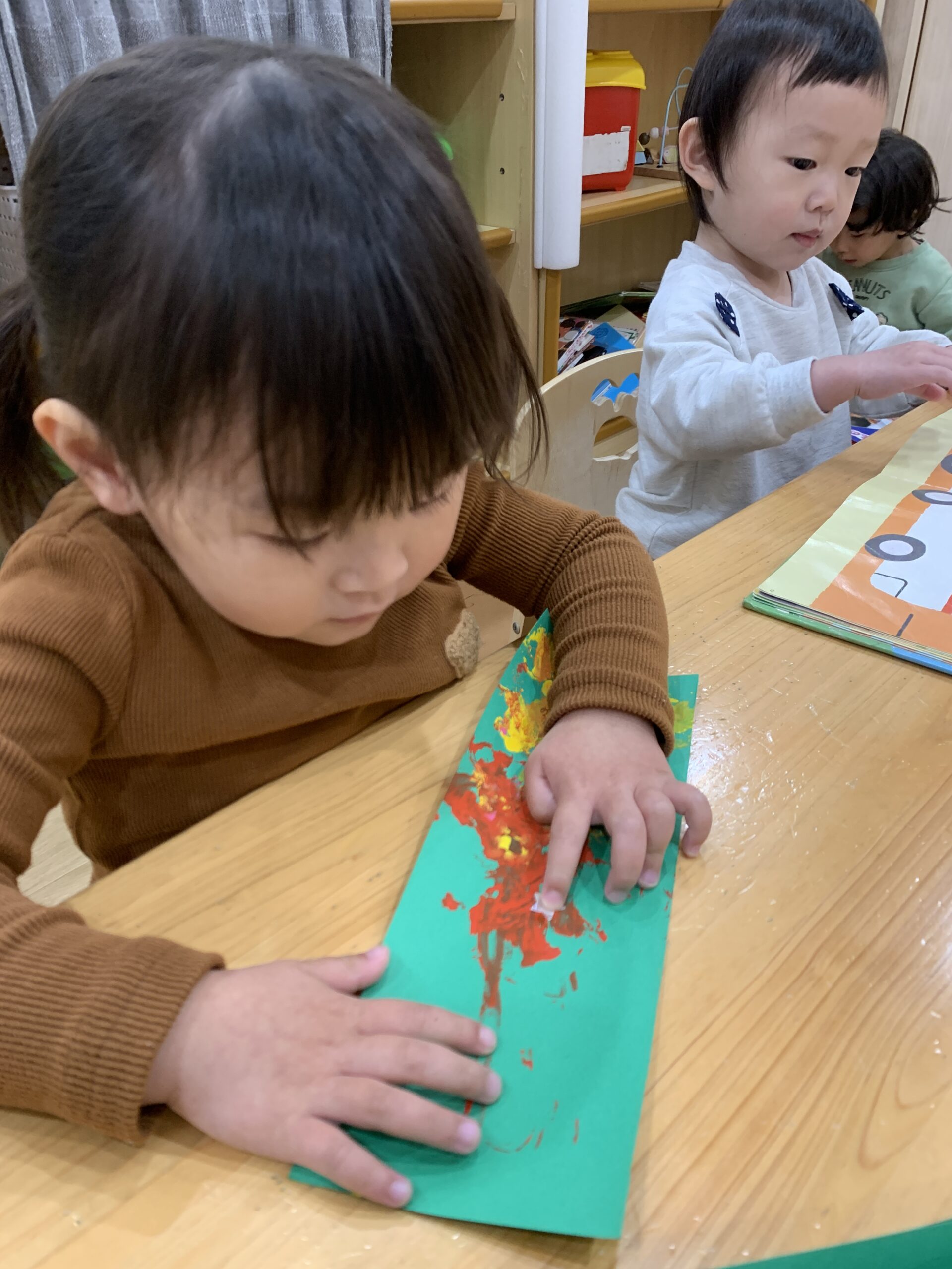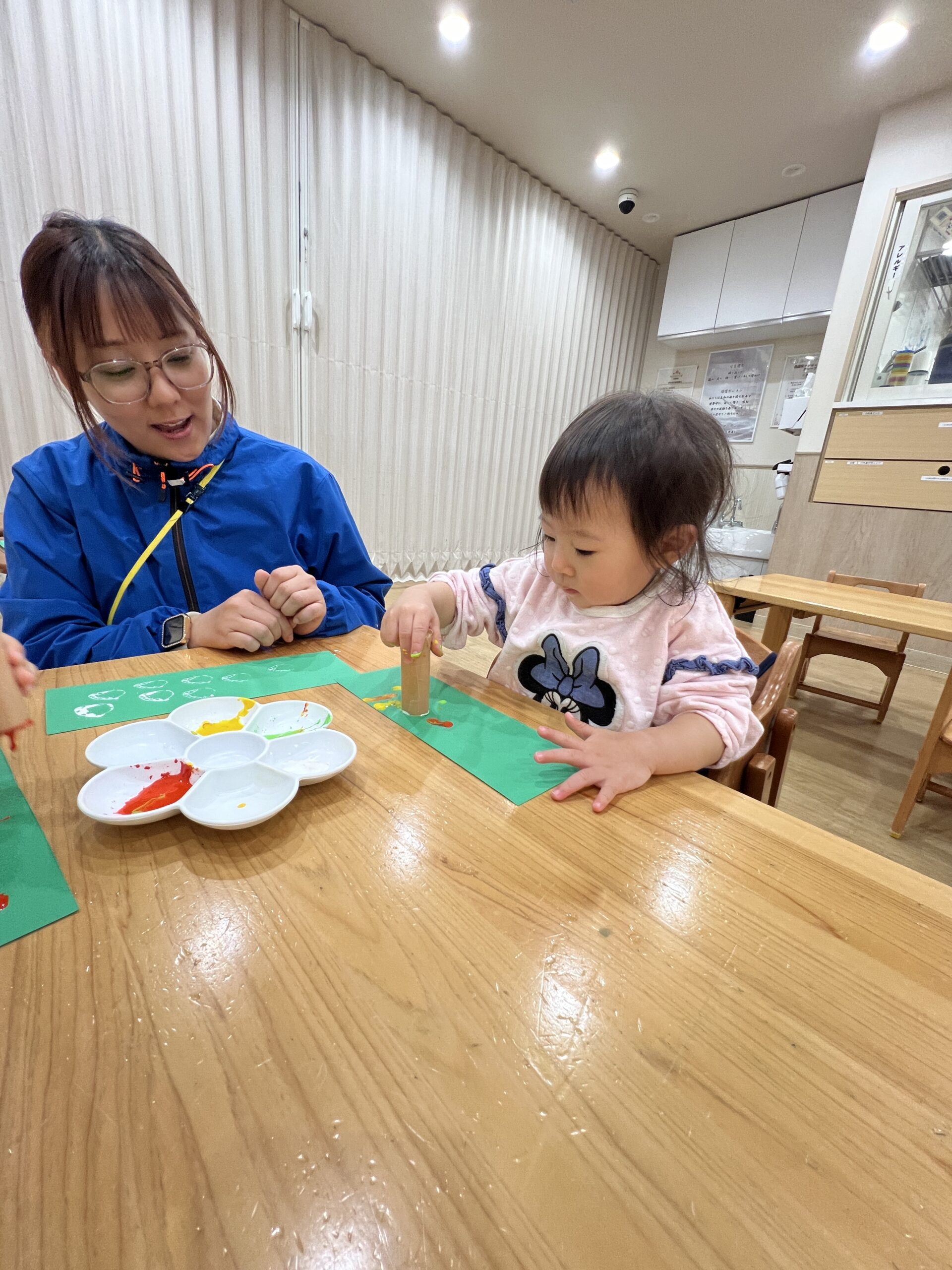 《1歳児の様子》~集中力と工夫する楽しさ、ダンボールスタンプで表現~