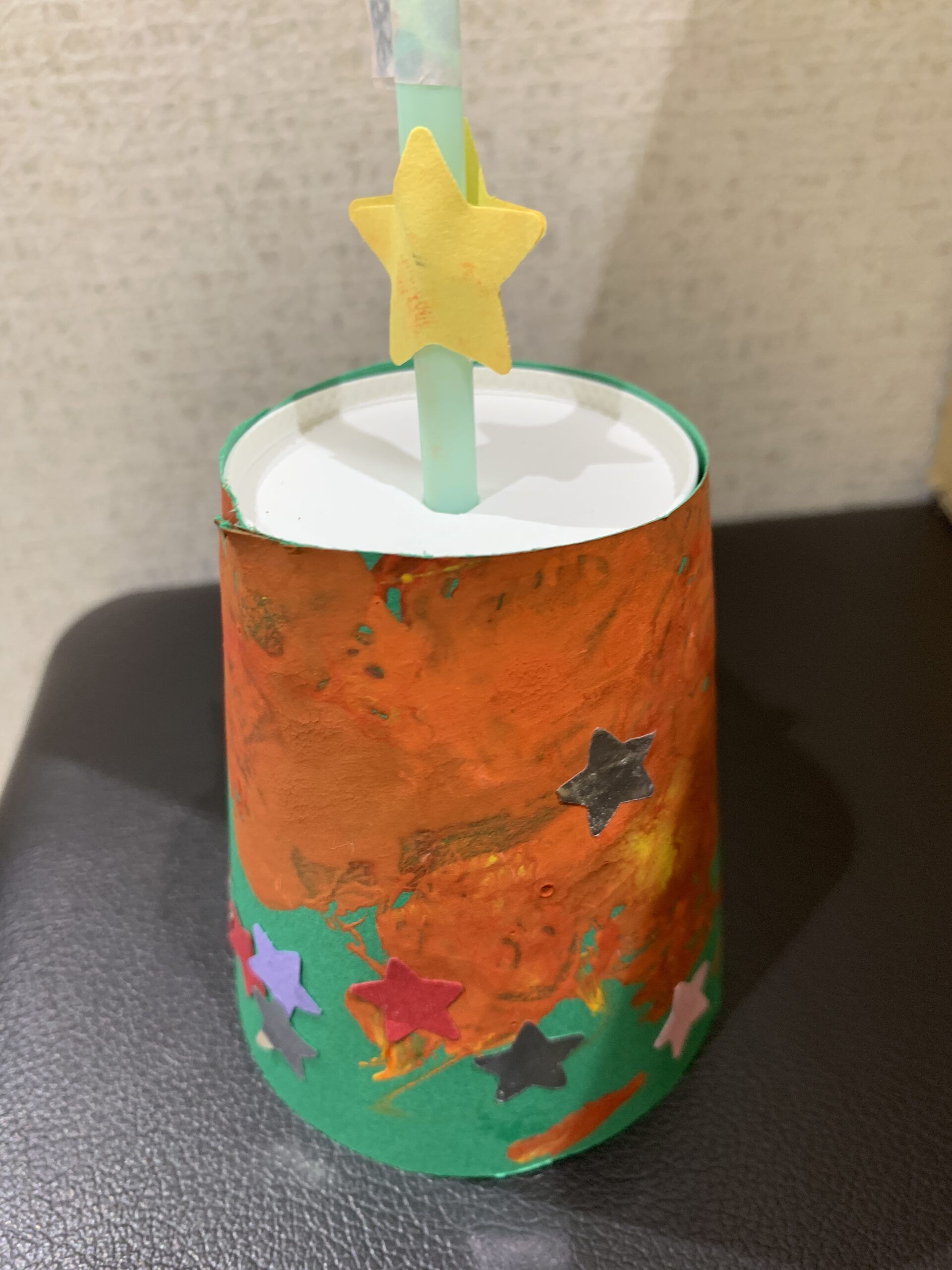 ダンボールスタンプだけでなく、キラキラの星の飾り付けなども加えて、自分だけのクリスマスツリーを装飾していきます。