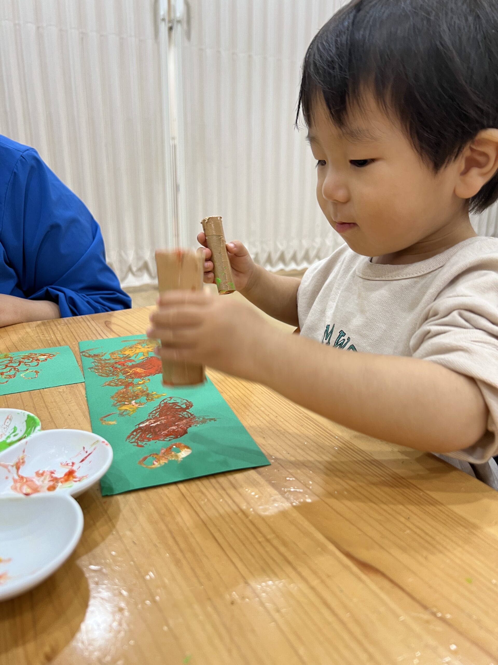 《1歳児の様子》~集中力と工夫する楽しさ、ダンボールスタンプで表現~
