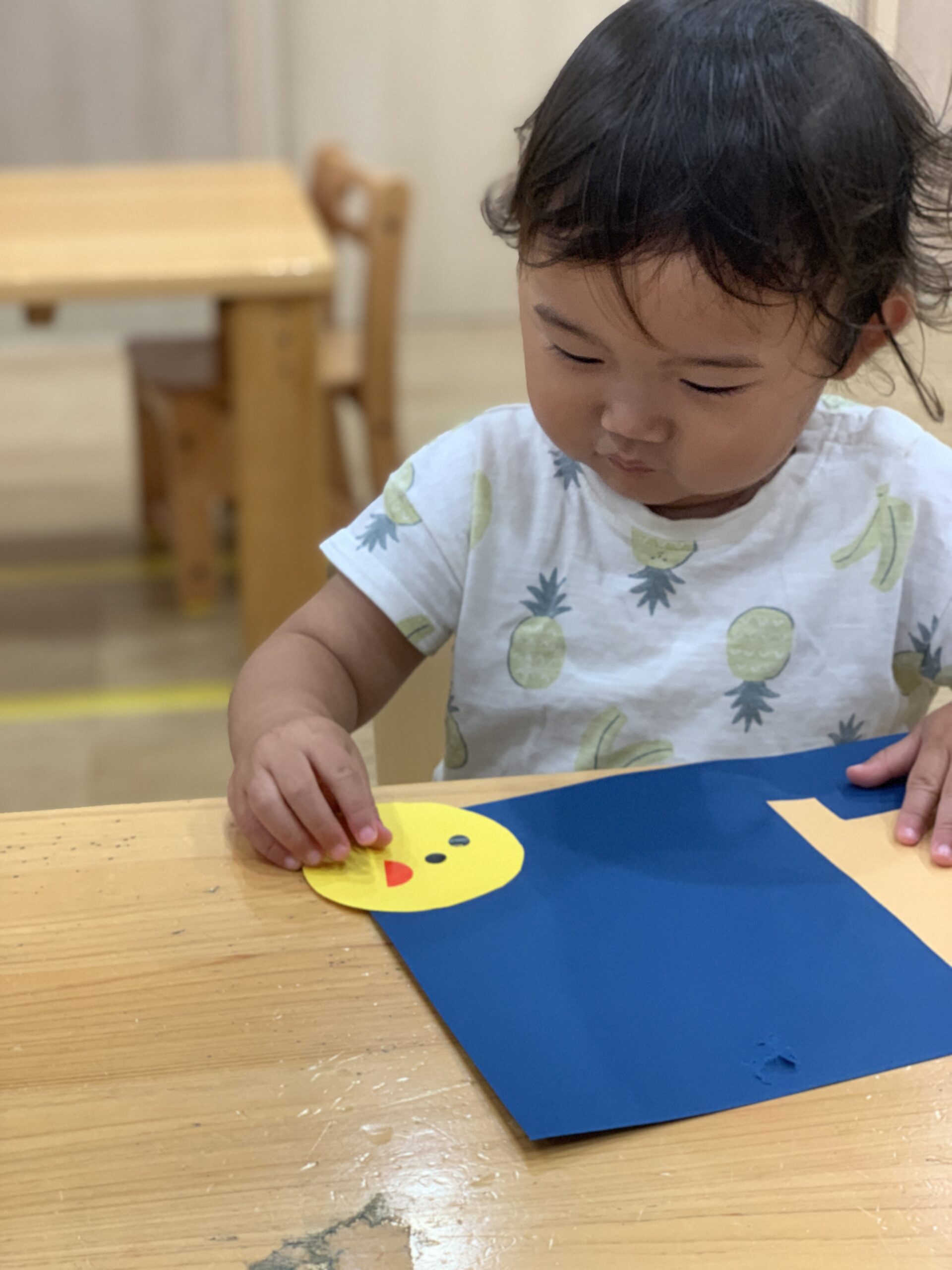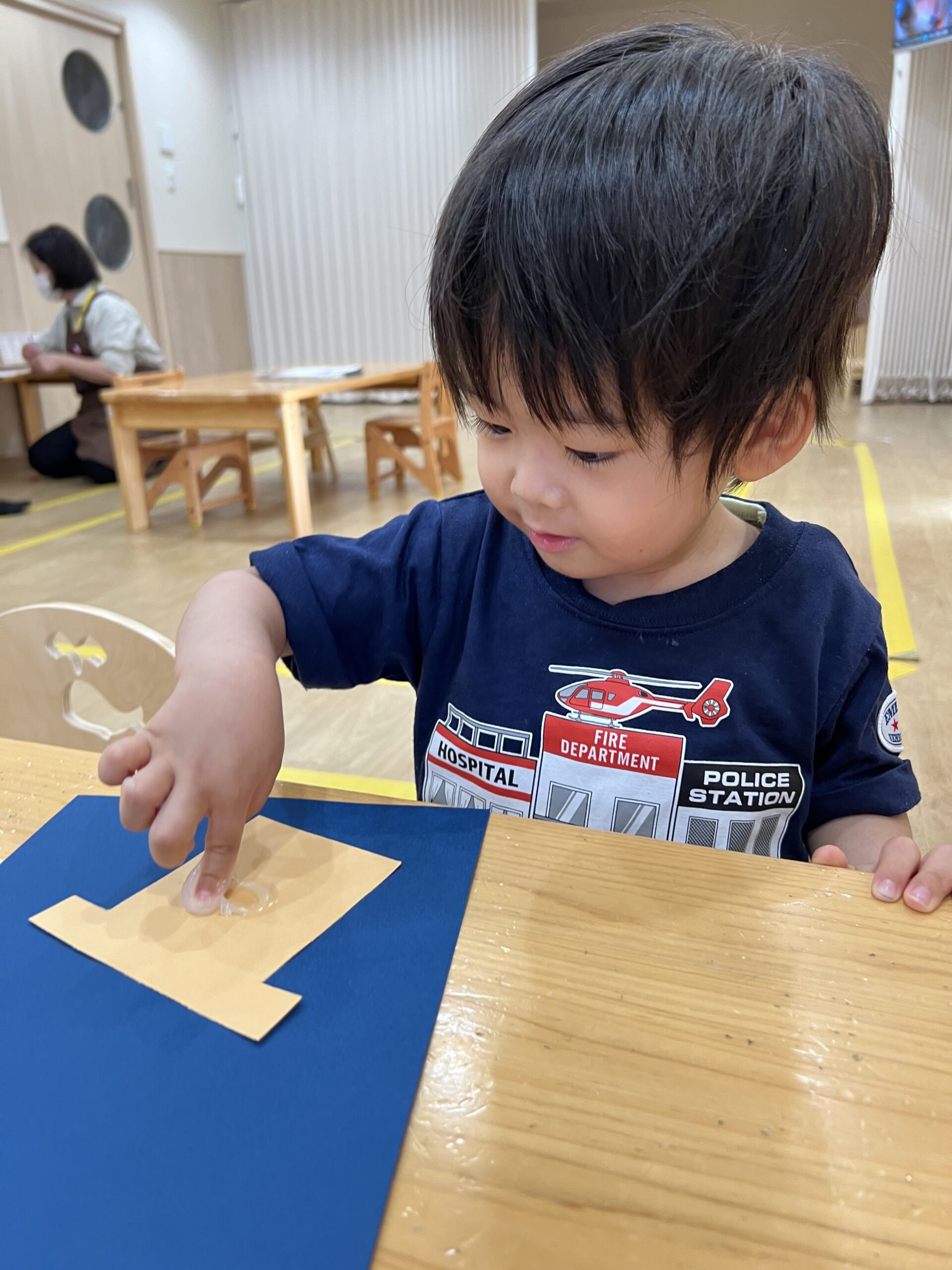 2歳児さんでは糊で張り付ける工程を自分の力で行いました。