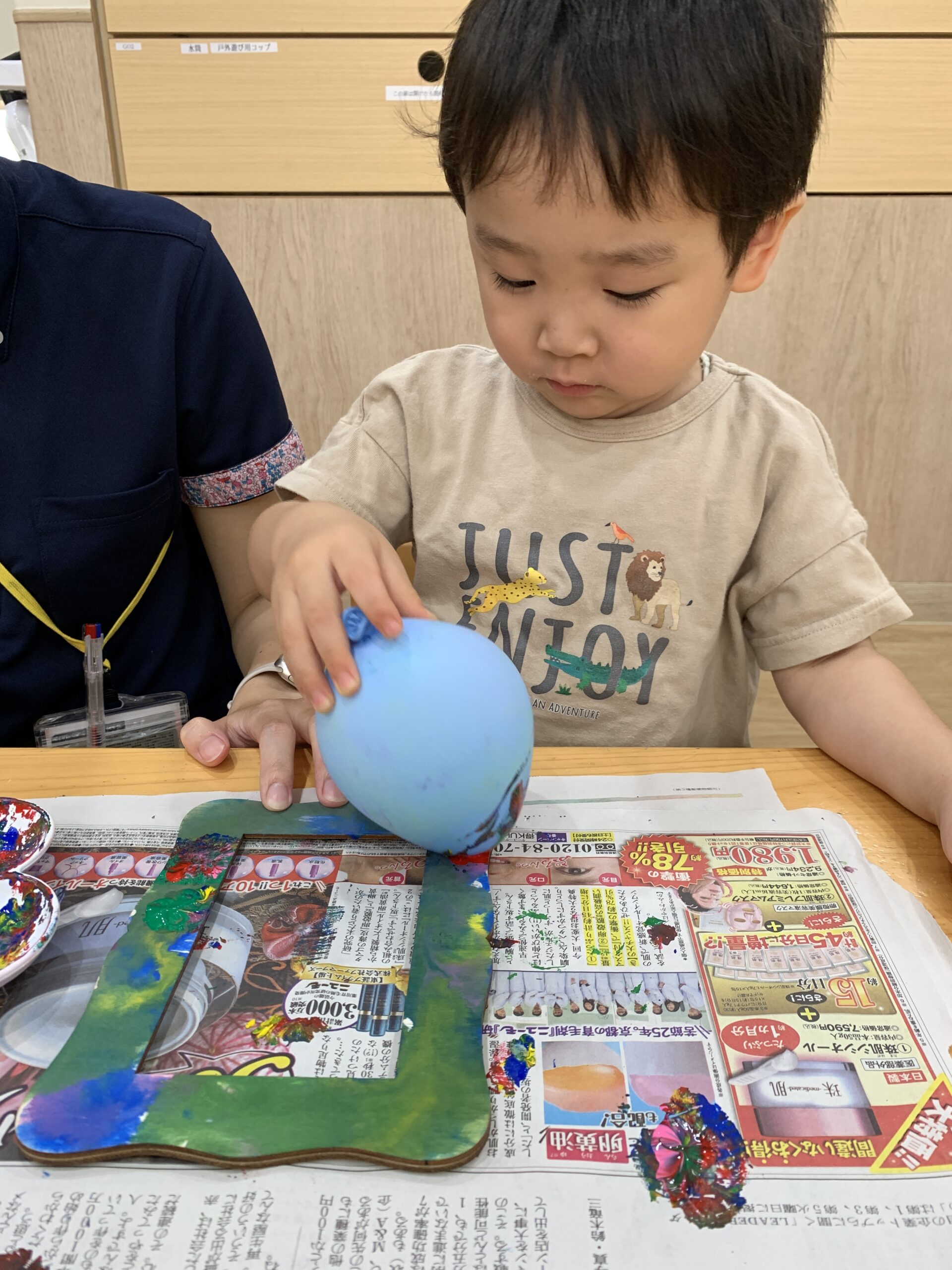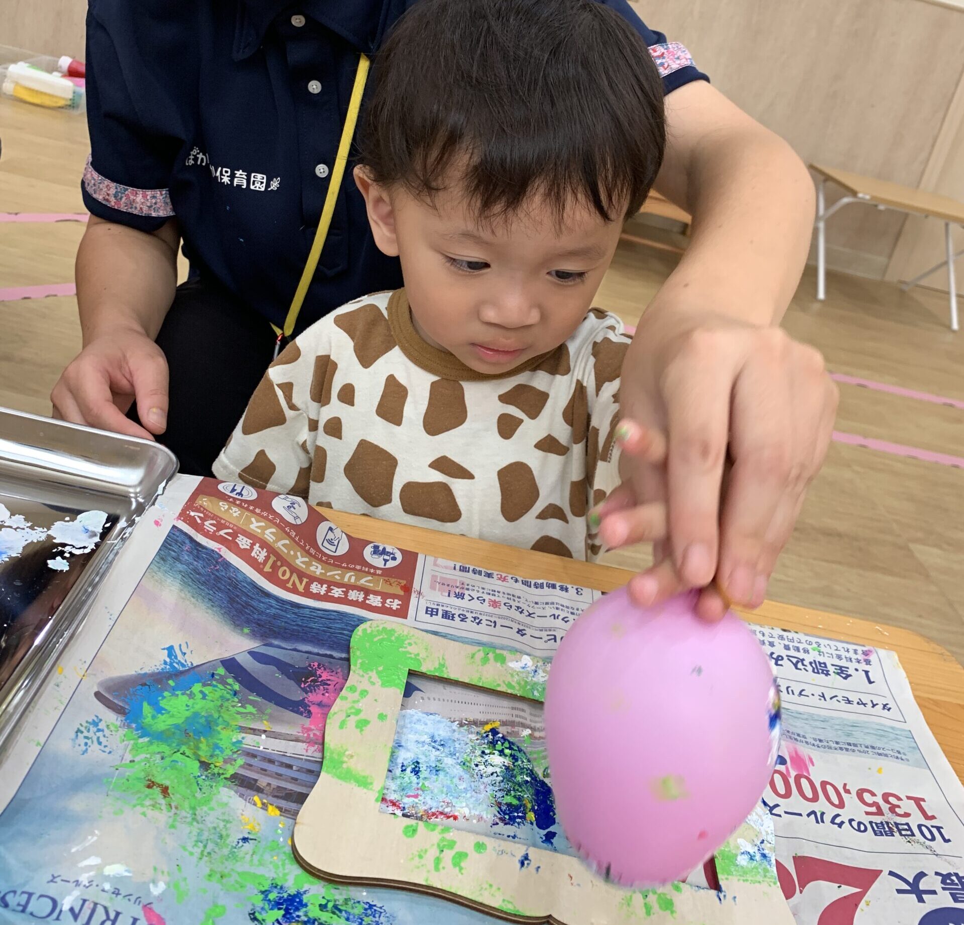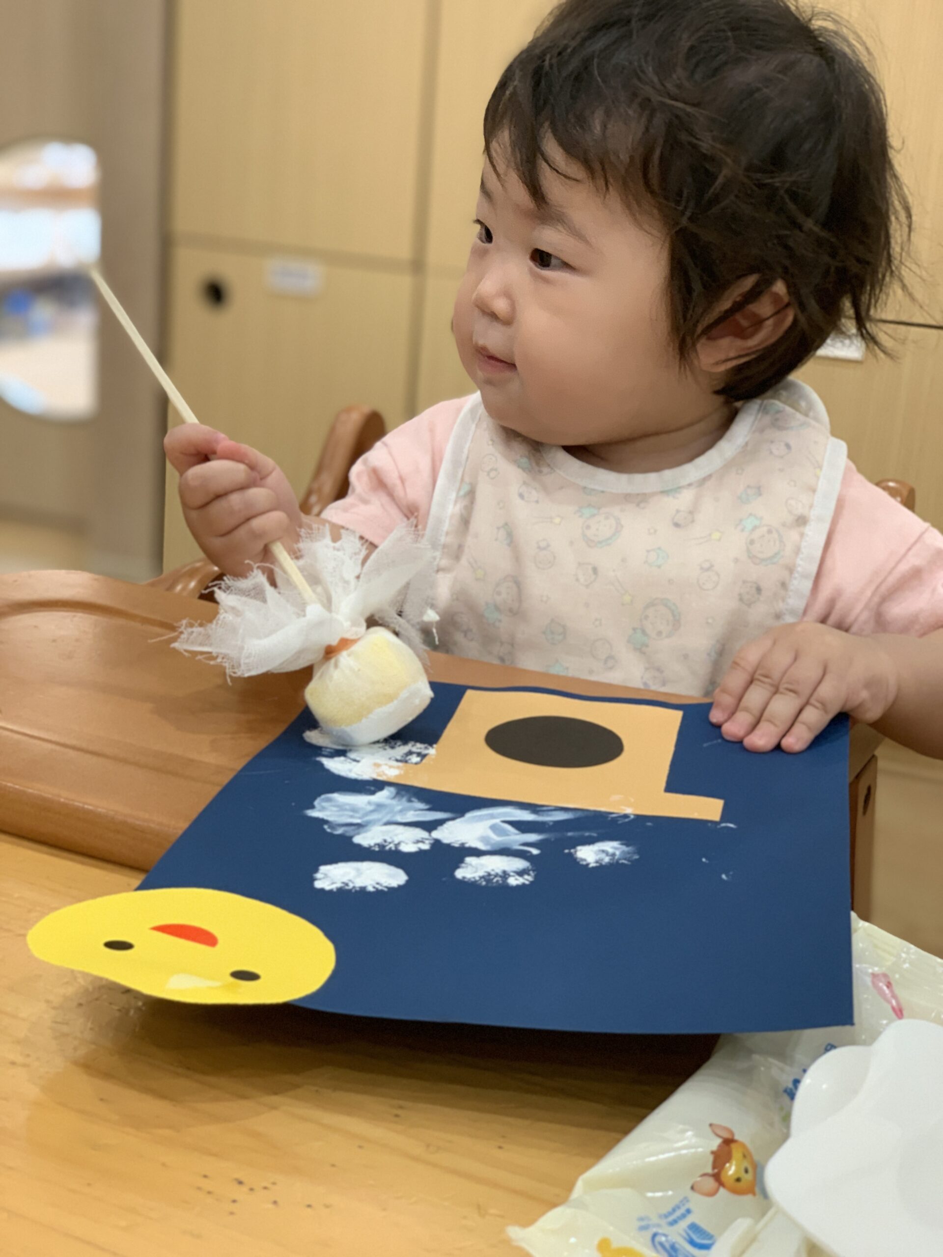 1歳児クラスでは、スタンプを押す強弱や形の変化に着目できるよう製作を楽しみました♬