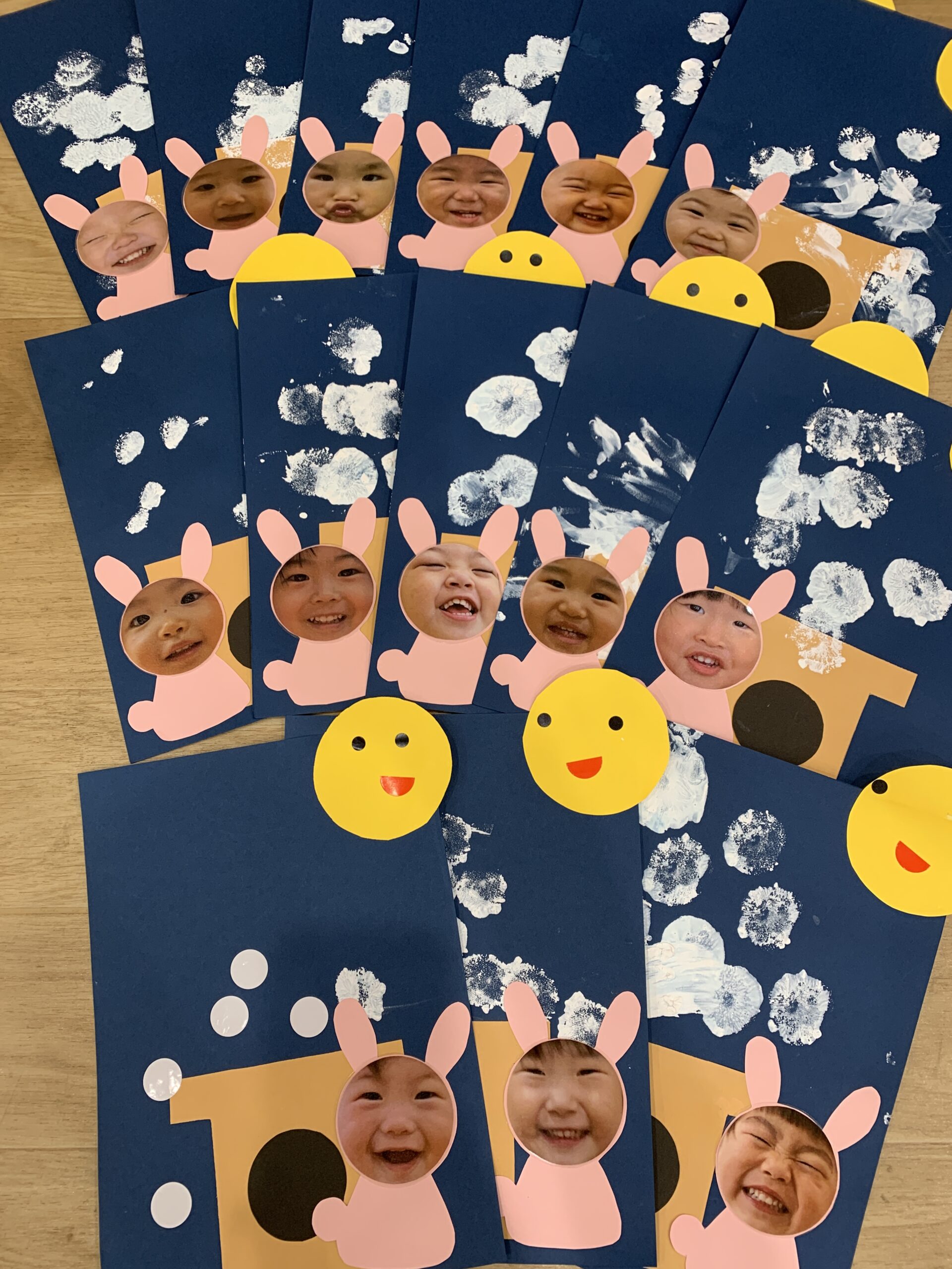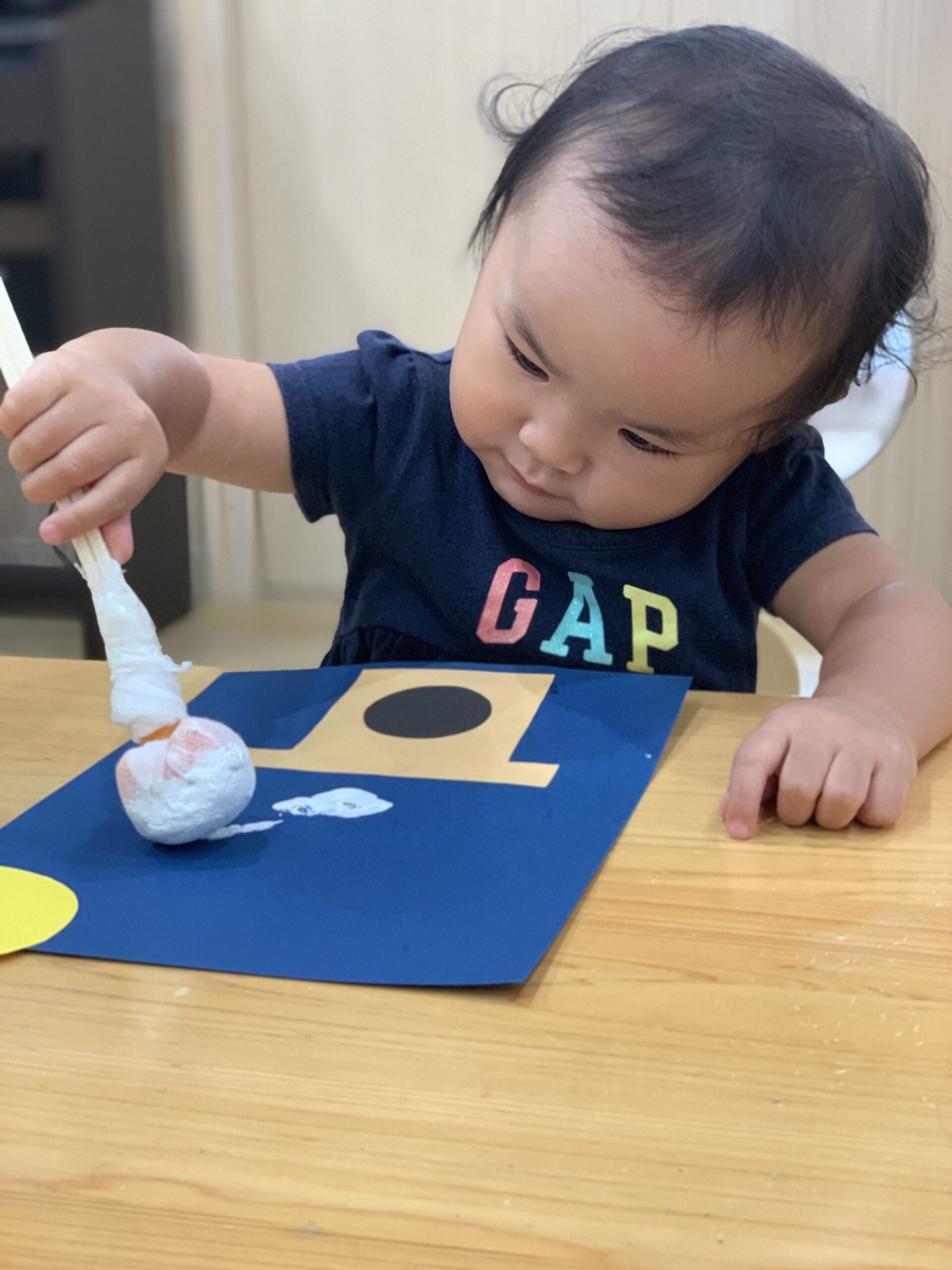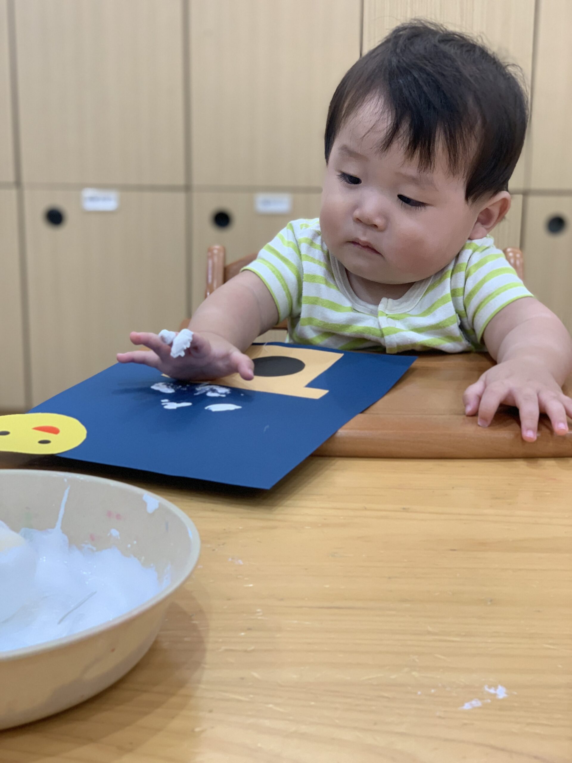 1歳児クラスでは、スタンプを押す強弱や形の変化に着目できるよう製作を楽しみました♬